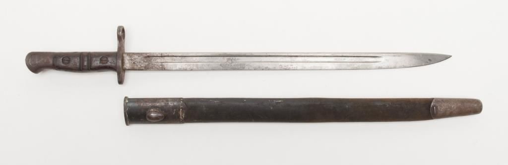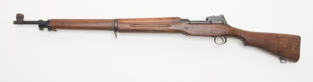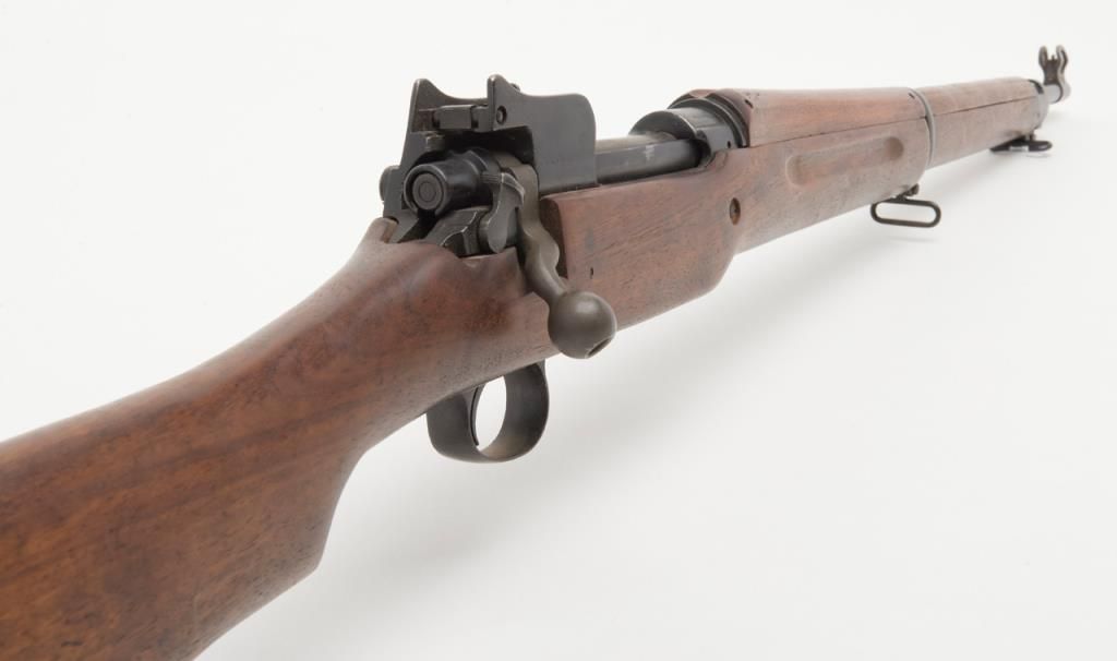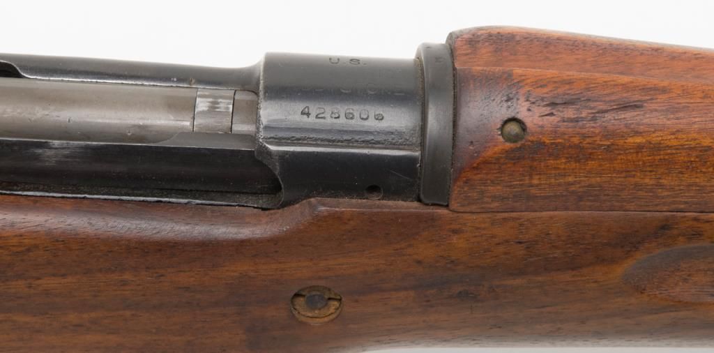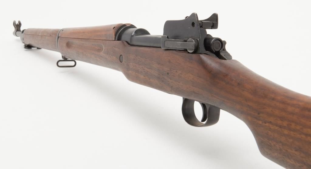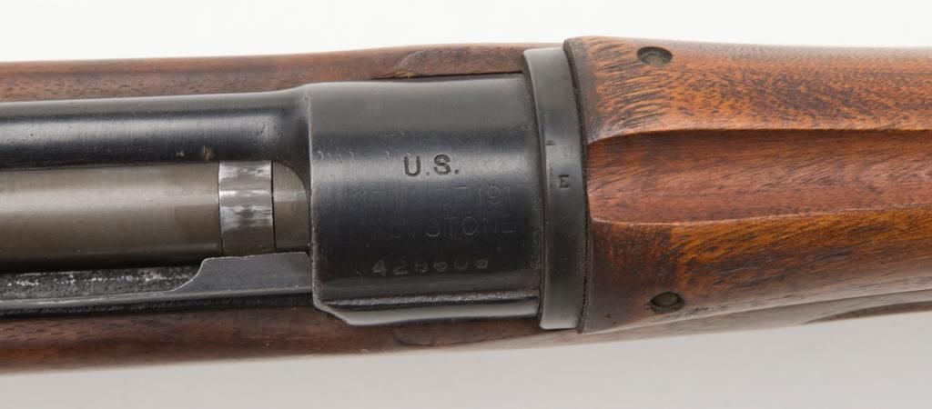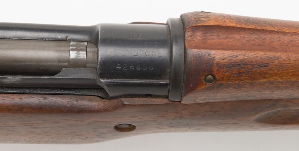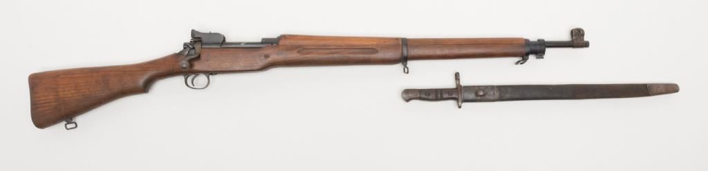US Model 1917 bolt action by Eddystone, 30/06 caliber, Serial #428606. The rifle is in overall very good condition as re-finished. The rifle retains the majority of its military finish, with a “U.S.” marked action. The smooth wood stocksare in very good condition as re-finished with small mars and a “3W” cartouche behind the trigger guard. The rifle comes complete with a 23” sword bayonet and leather scabbard. The bore is good, the action crisp and markings legible on thisrifle. (C+R/PPT). Est. $250-$500.