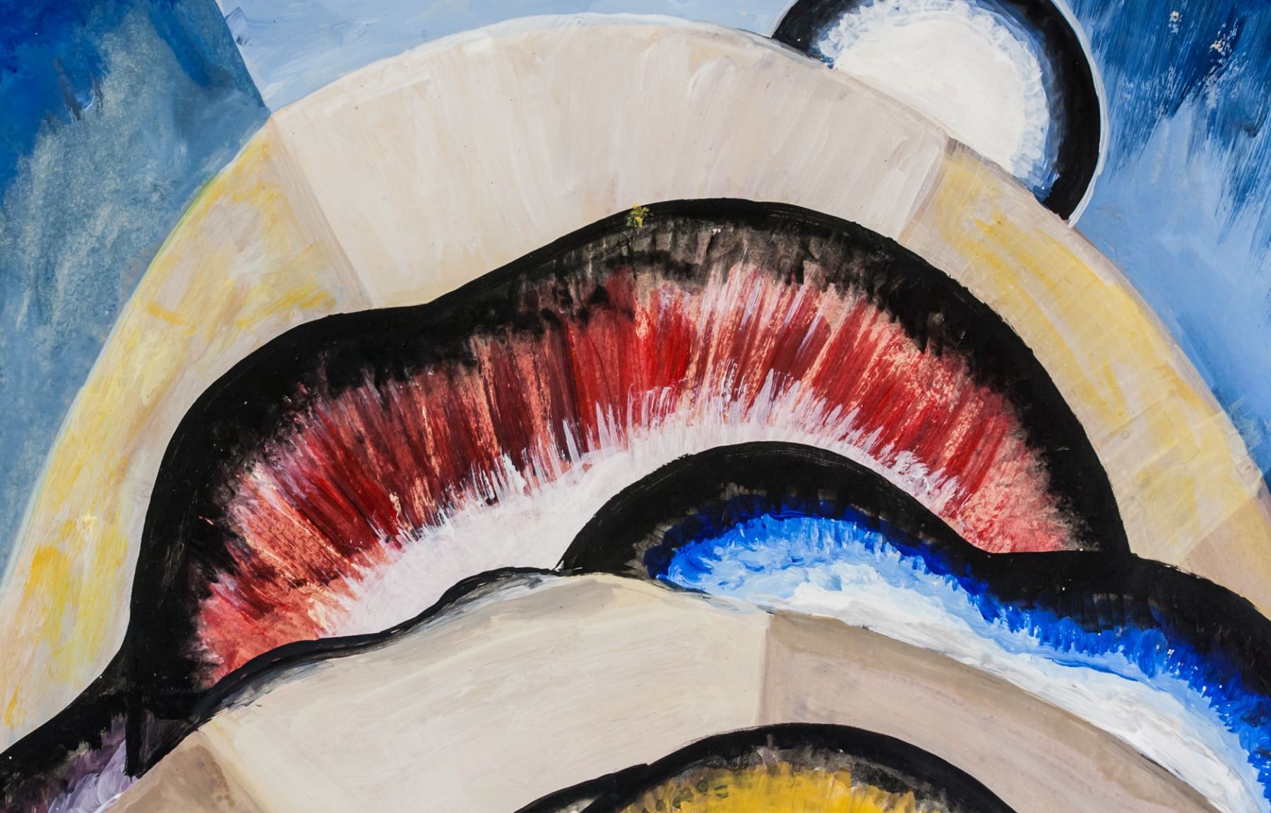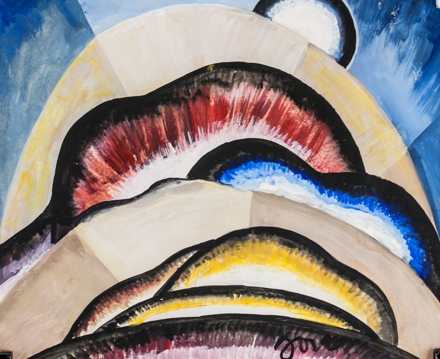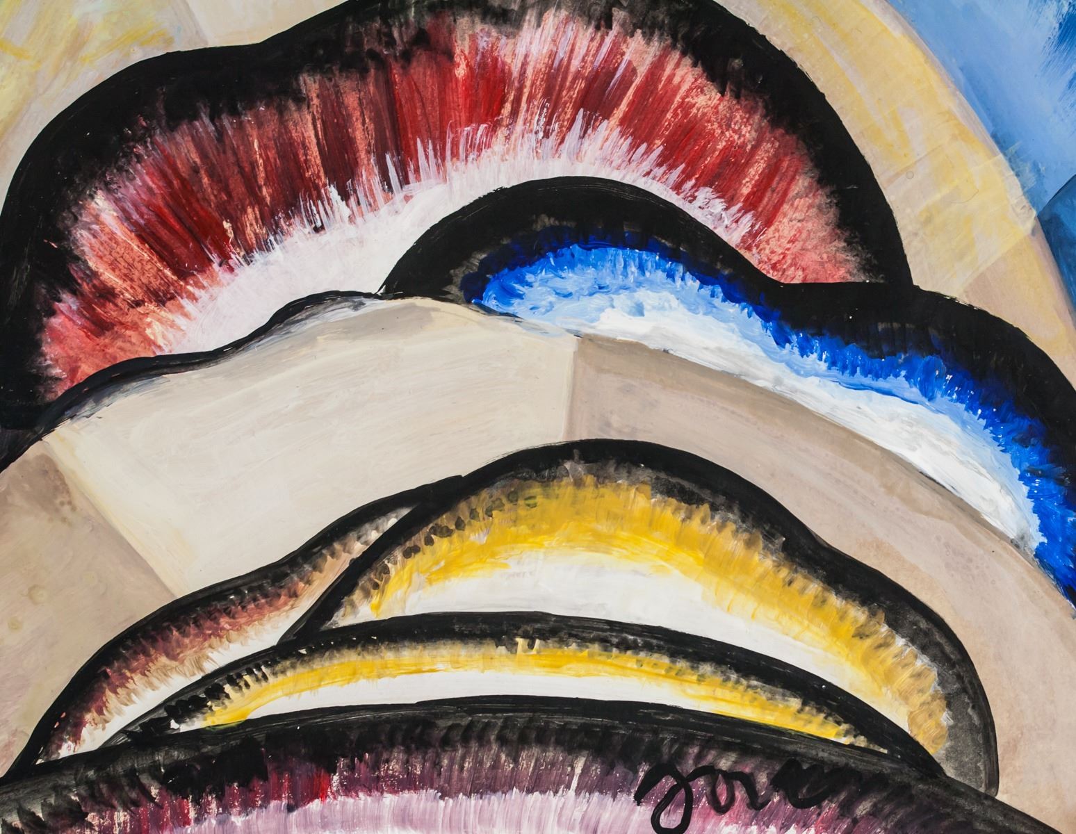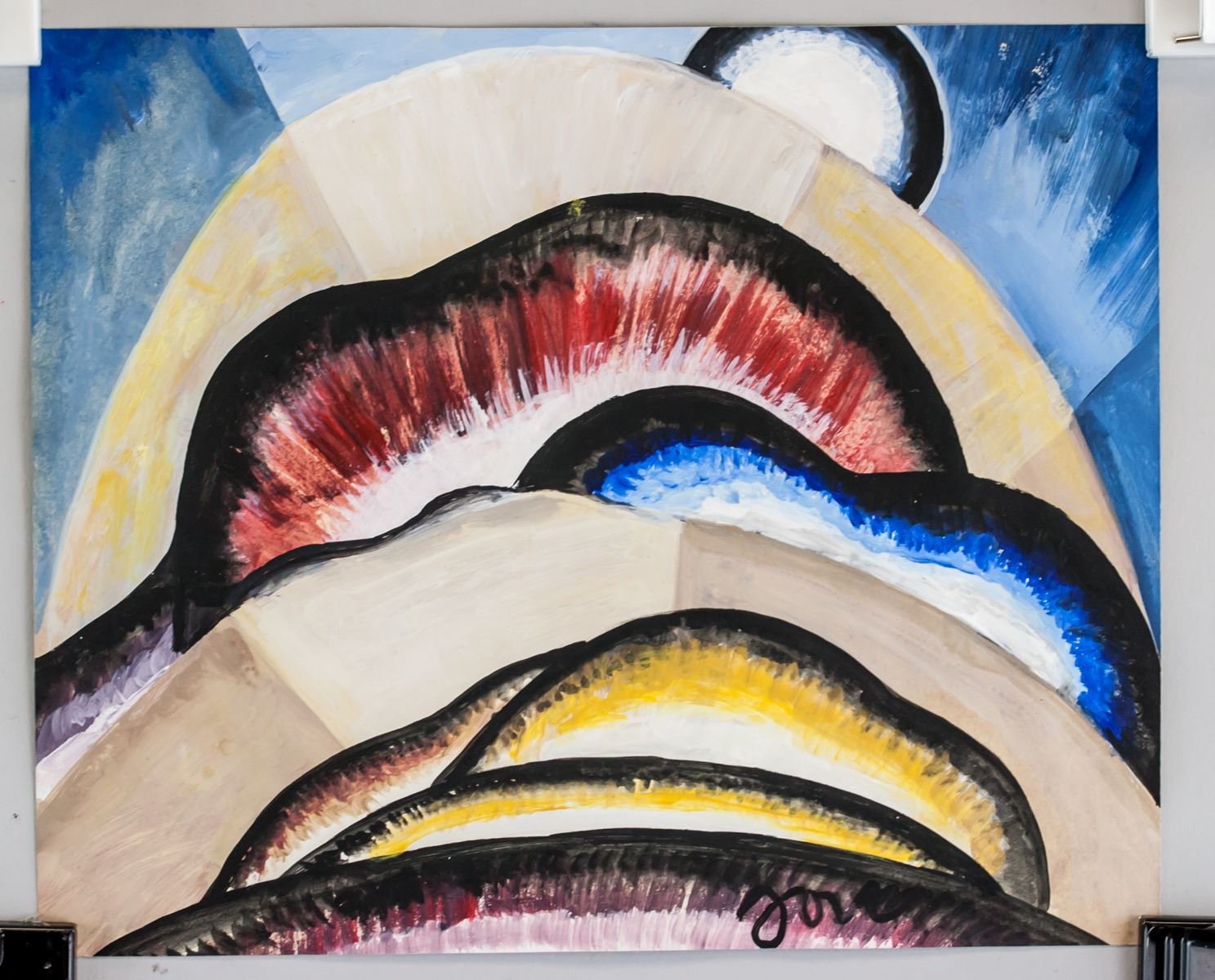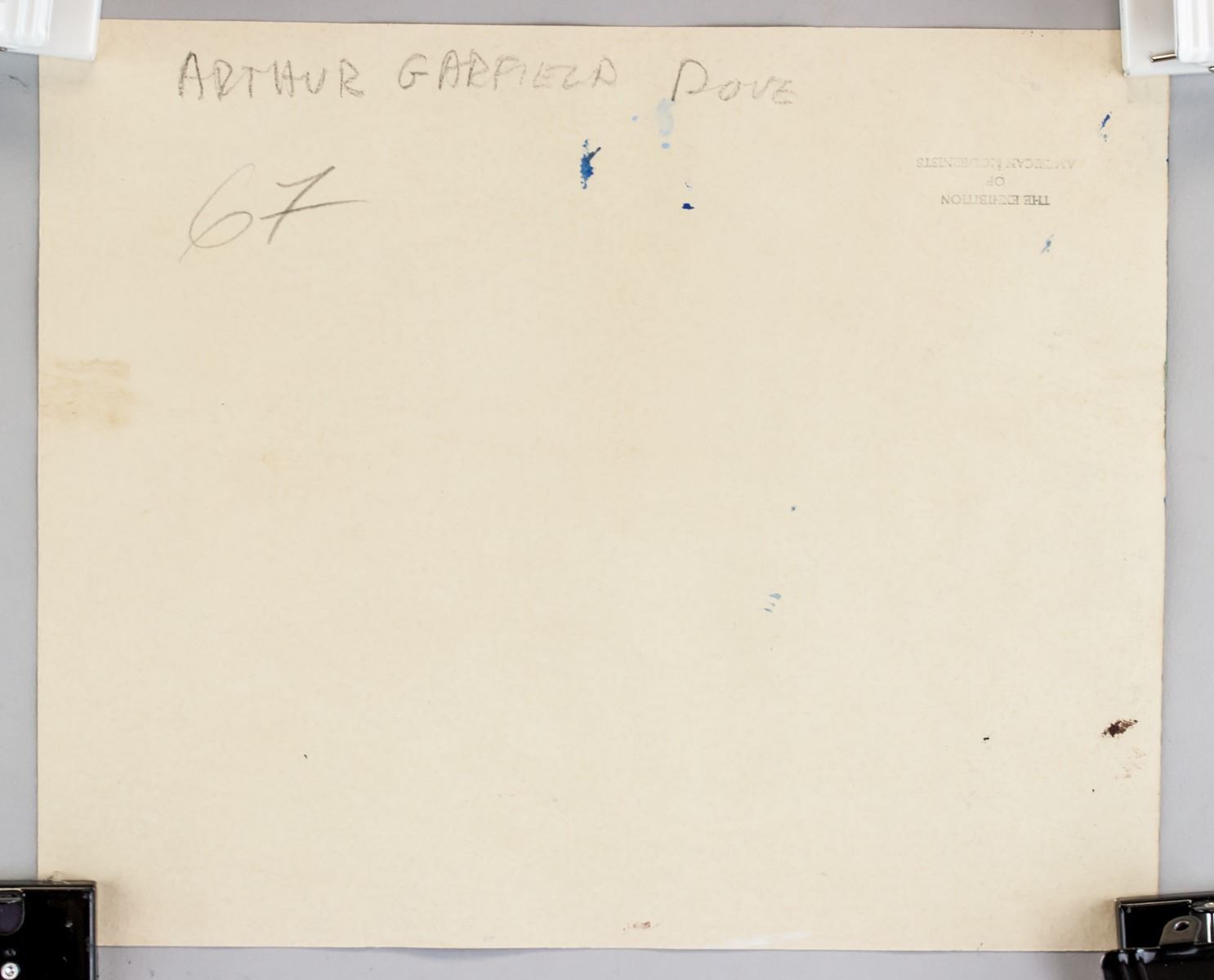 Gouache on paper. Featuring a modernist landscape scene. Signed illegibly on the lower right corner. Inscribed and dated 67 on verso. Stamped THE EXHIBITION OF AMERICAN MODERNISTS on verso. 19.5 x 24 cm (7.7 x 9.5 inches). PROVENANCE: Southern Ontario estate