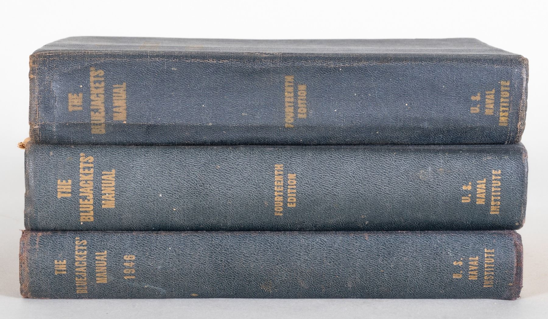 Lot of three manuals for new 'Bluejackets' or Naval personnel. One is the thirteenth edition, issued in 1946. Two are the fourteenth edition, issued in 1950. U.S. Naval Institute, Annapolis, MD. Previous owners inscriptions in two of the books, 'Francis C. Kramar S.R. 443-85-20' and 'Wesley Skilton VF 79 7229 Bingham St. Phila. Penna'. Approx. 622 pages. 7.75 x 5.25 inches. Minor wear from age. Items are from the estate of Frank and Elizabeth Kramar, United States Navy and Marine Corps veterans. Frank was an Aviation Machinist’s Mate and Elizabeth was an AX Senior Staff. Frank was awarded three bronze stars in 1966 and together they retired with a combined 48+ years of service. They will soon come to rest at Arlington National Cemetery in Virginia.