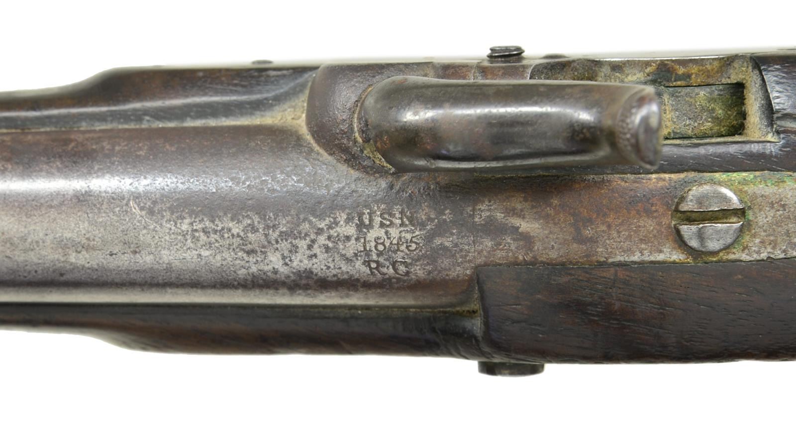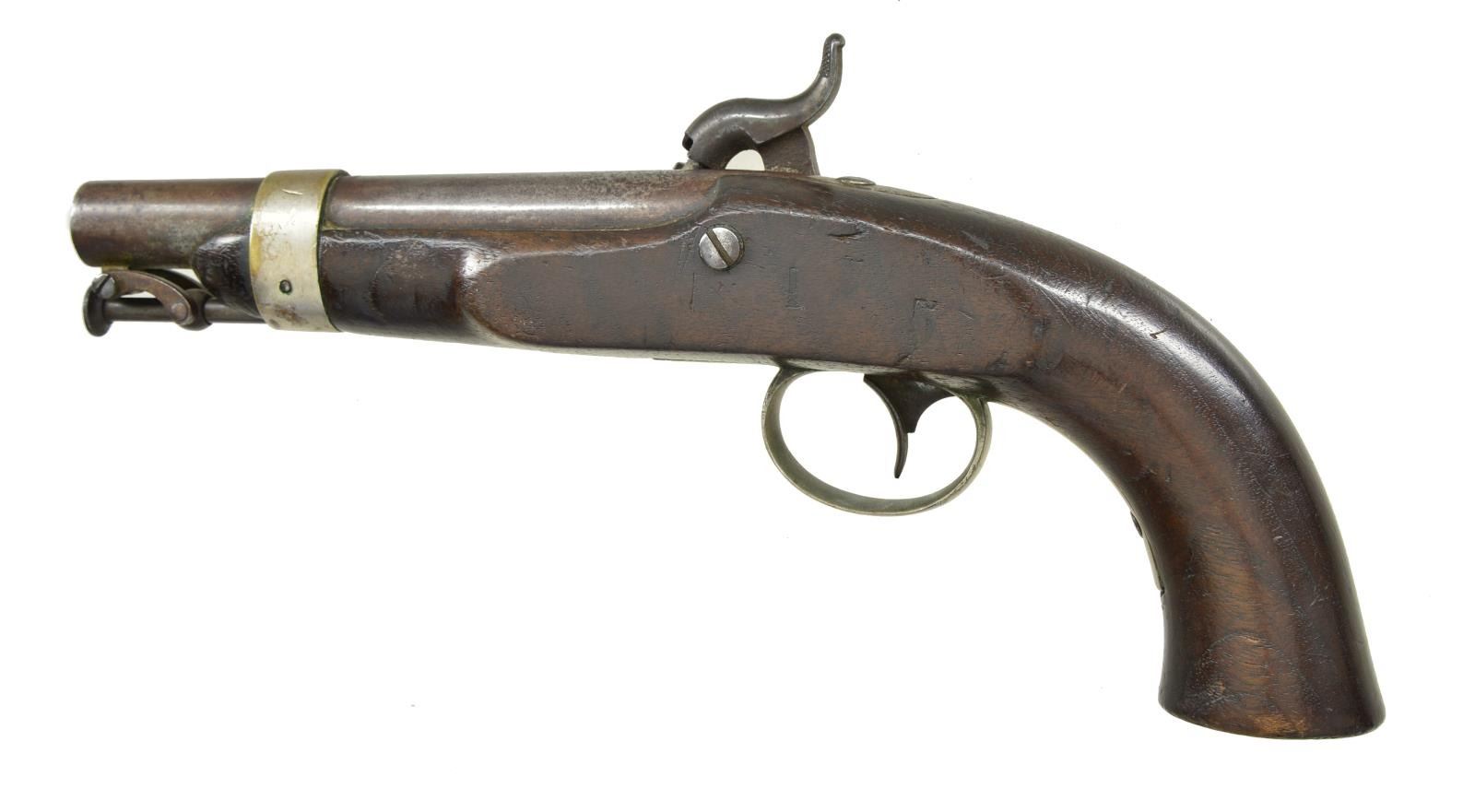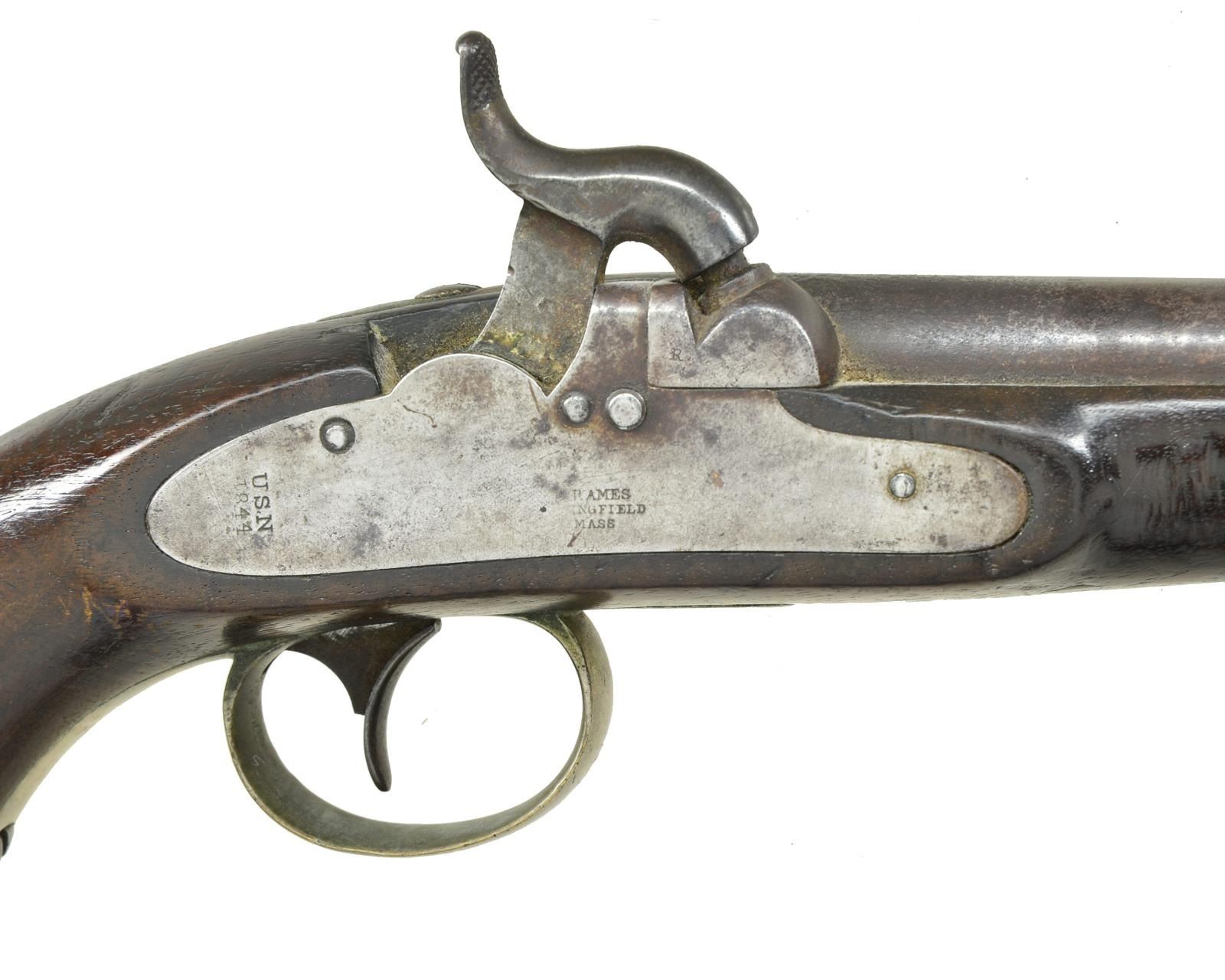 PERCUSSION PISTOL. 54 Cal. NSN. Standard configuration, 12” overall, 6” round barrel proofed “USN / 1845 / RC / P” at breech, nickel plated brass furniture, lock under hammer “N. P. AMES / SPRINGFIELD / MASS” & “USN / 1844” at tail, captured swivel loading assembly. 2000 of this 1st American percussion pistol contracted by Ames, plating was later done by navy department and not contractor. CONDITION: very good overall, original & complete, stock sound with scattered cosmetic bruises, heavy edge wear, mechanics fine, smooth clear bore. (01-21476/JS). ANTIQUE. $2,000-3,000.
