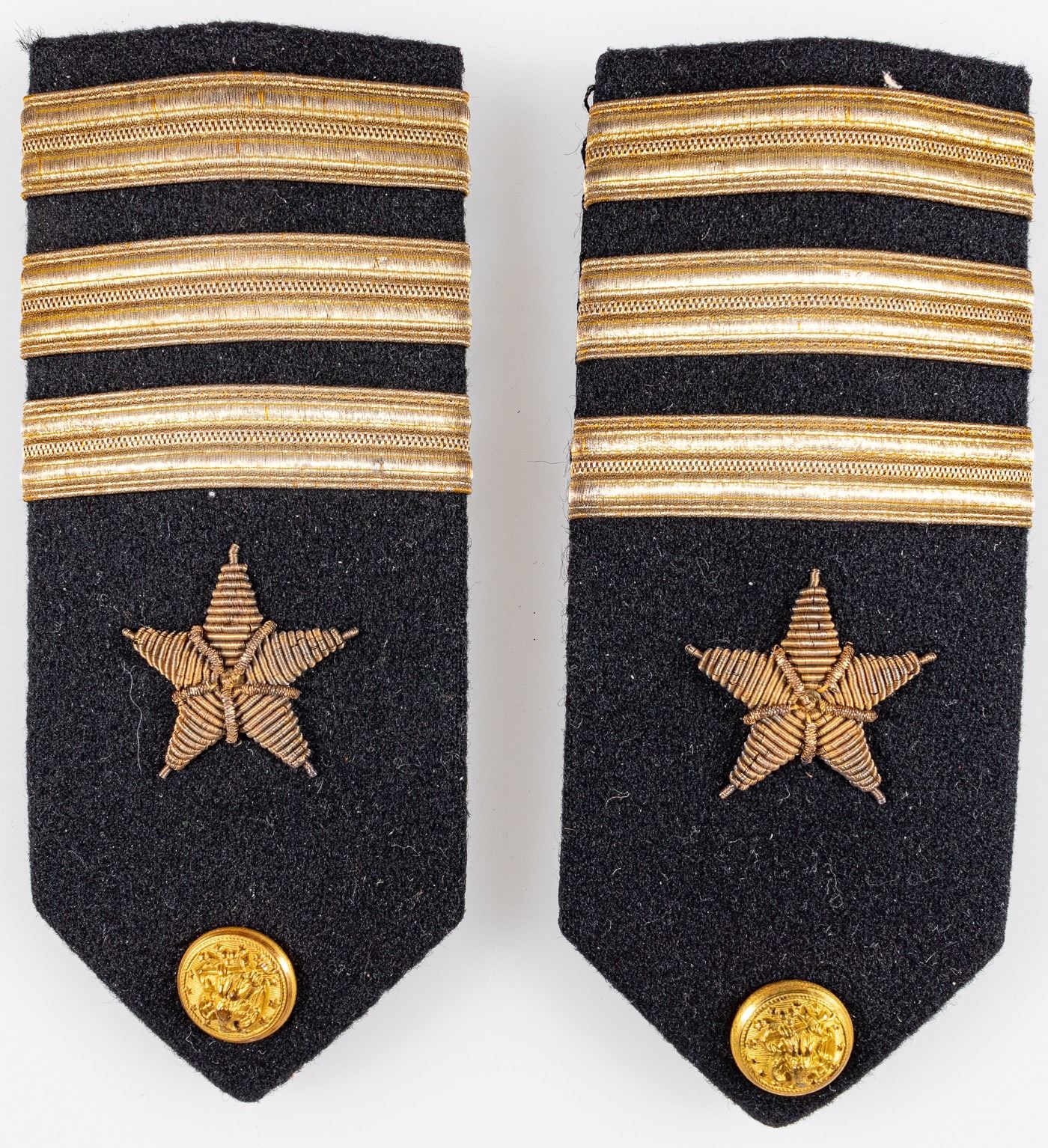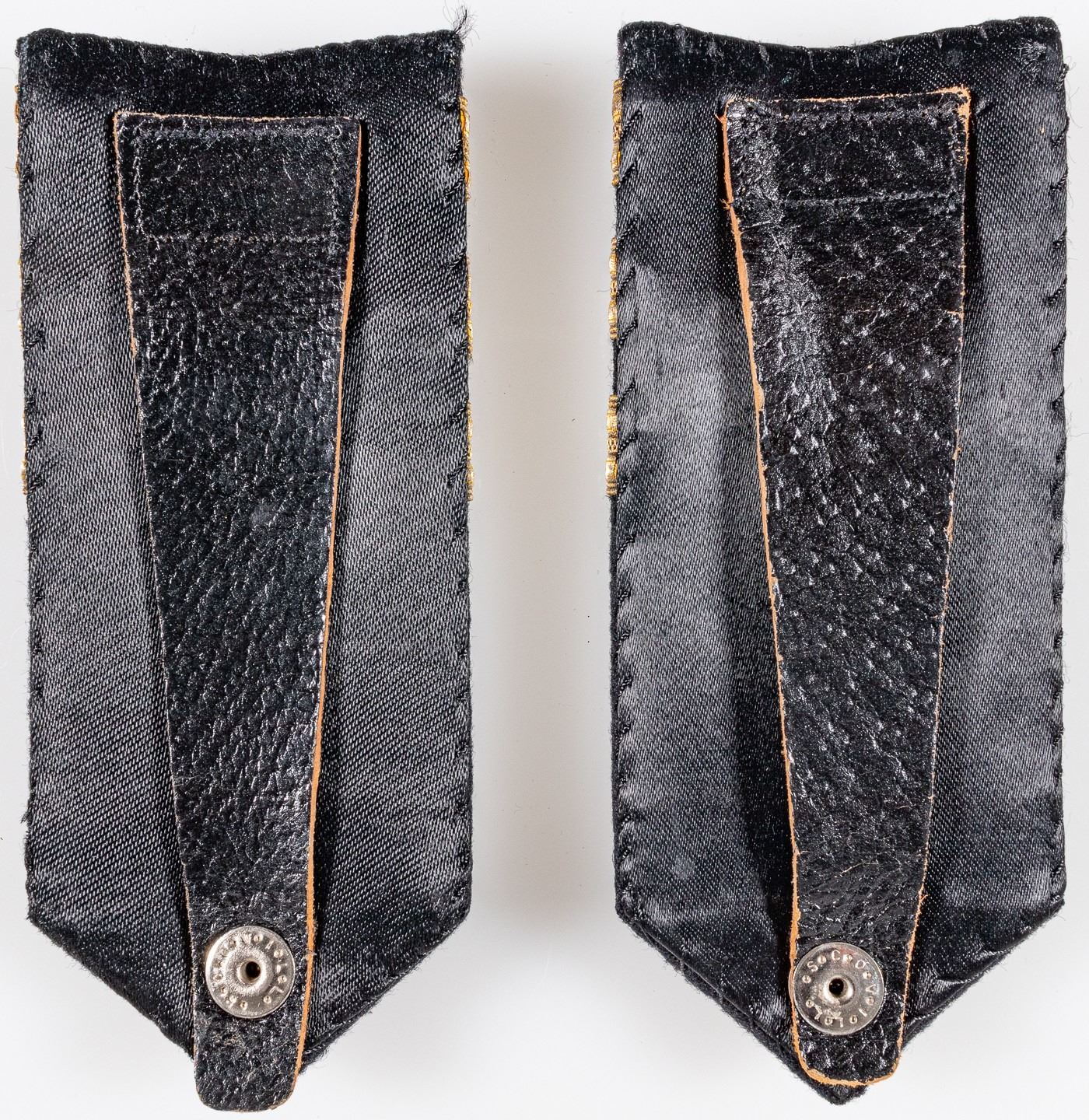 Pair of two cased US Navy shoulder boards for a Commander. Gilded US Navy buttons and stripes with buillon stars. Boards are held onto uniform with leather straps. Case marked with 'Hilborn-Hamurger, Inc., New York, New York'. n.d. Unmarked. 5.5 x 2.5 inches. Case has minor damage and abrasions.