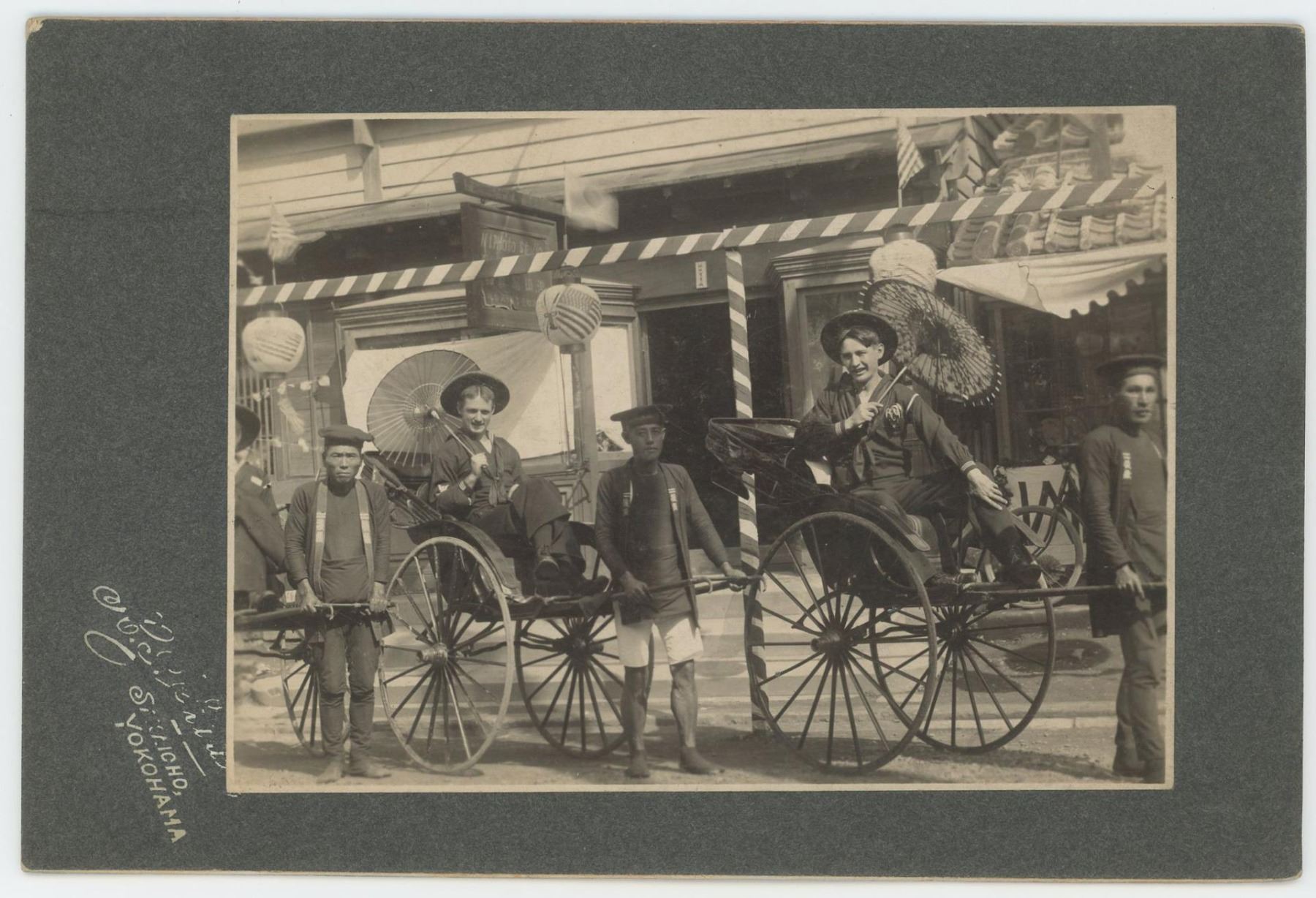 Nice image showing American Sailors interacting with local rickshaw drivers. Dated 1920 Taken in Yokohama, Japan.