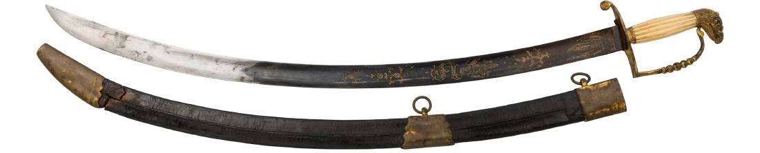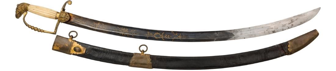 Beautiful Eagle's Head Pommel U.S. Infantry Officers' Sword. 30 -inch curved, wide blade finished in blue with gilt-accented engraving, foliate patterns and an American eagle with "E Pluribus Unum" banner. The blade is marked "Warranted". The gilded-brass hilt features a langet adorned with an American eagle, and fluted bone grip. Black leather scabbard with gilded-brass throat and drag, two mounting rings and frog stud.