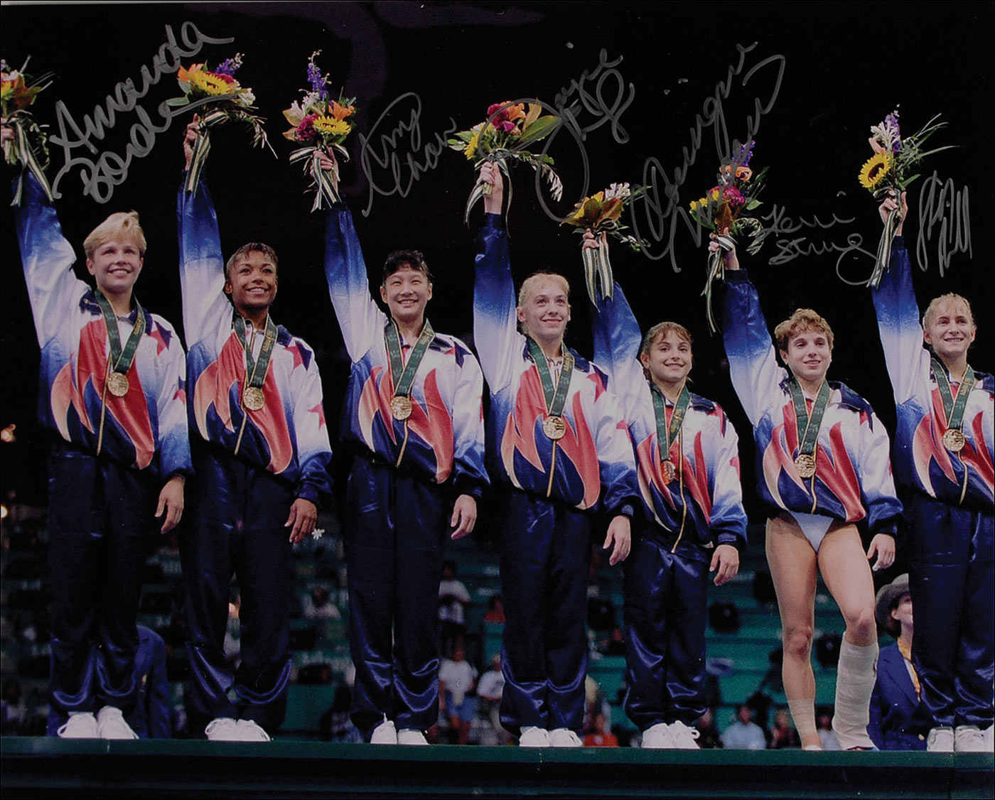 Stunning color satin-finish 20 x 16 photo of the ‘Magnificent Seven,’ signed by six of the Gold Medal winners in silver ink: Amanda Borden, Shannon Miller, Dominique Moceanu, Amy Chow, Kerri Strug, and Jaycie Phelps. In fine condition.