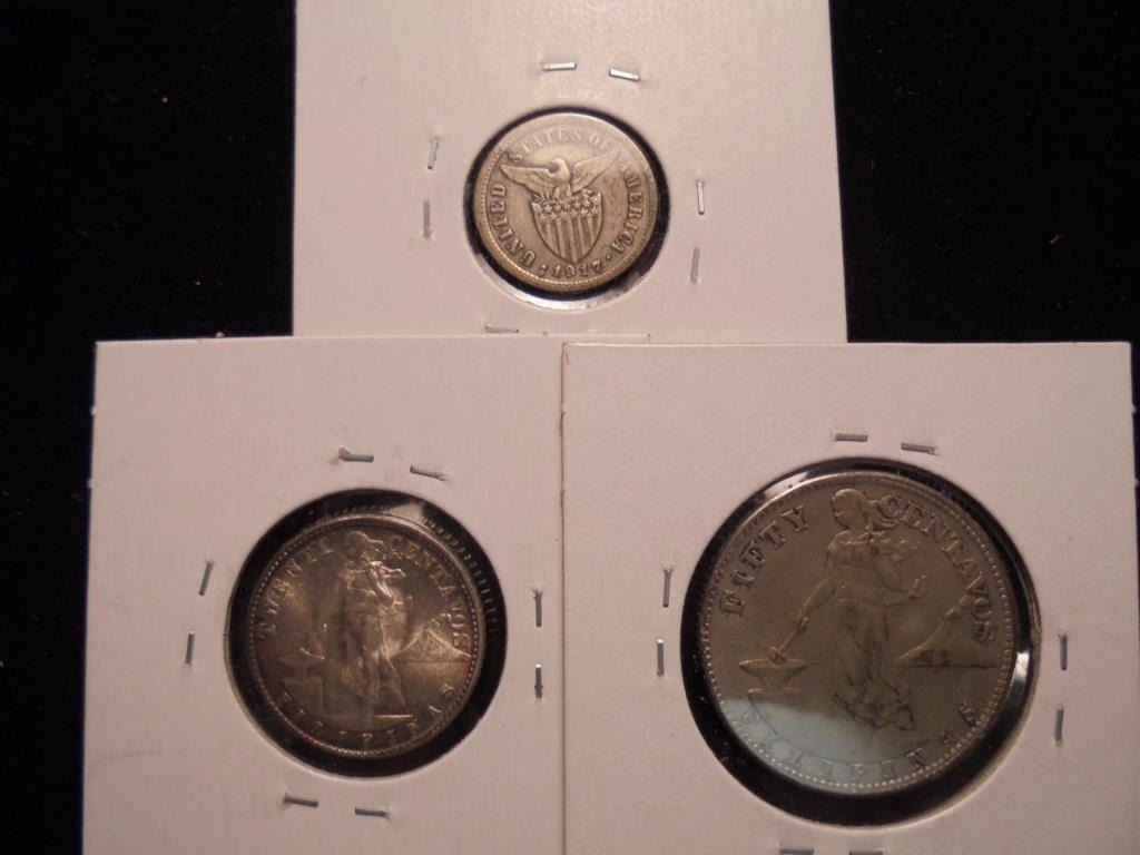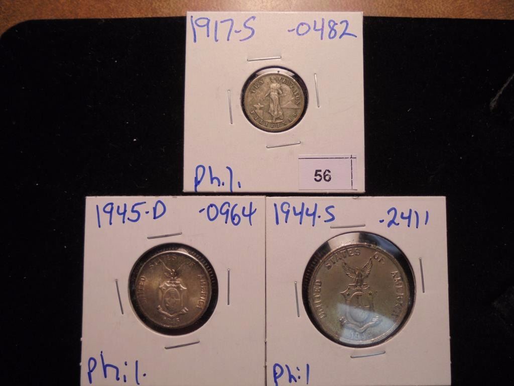 US/PHILIPPINES SILVER 1917-S 10 CENTAVOS, 1945-D 20 CENTAVOS AND 1944-S 50 CENTAVOS, .3857 OZ. ASW T