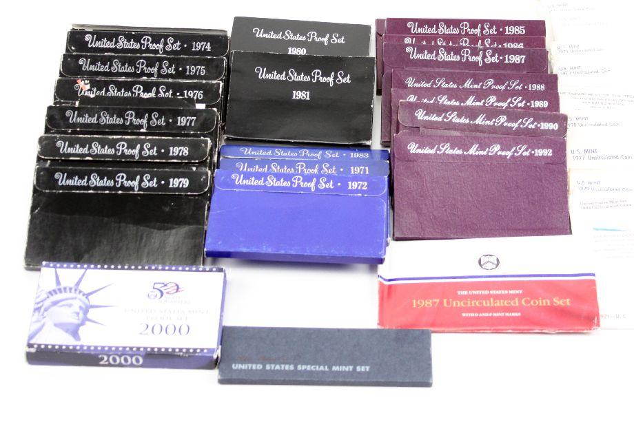 P&D uncirculated US mint sets 1971 - 1979, 1982 & 1987. US proof sets 1971-1981,1983-1990, 1992 & 2000.