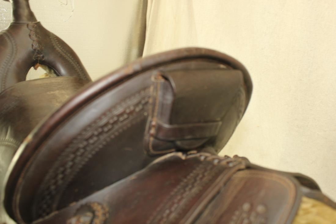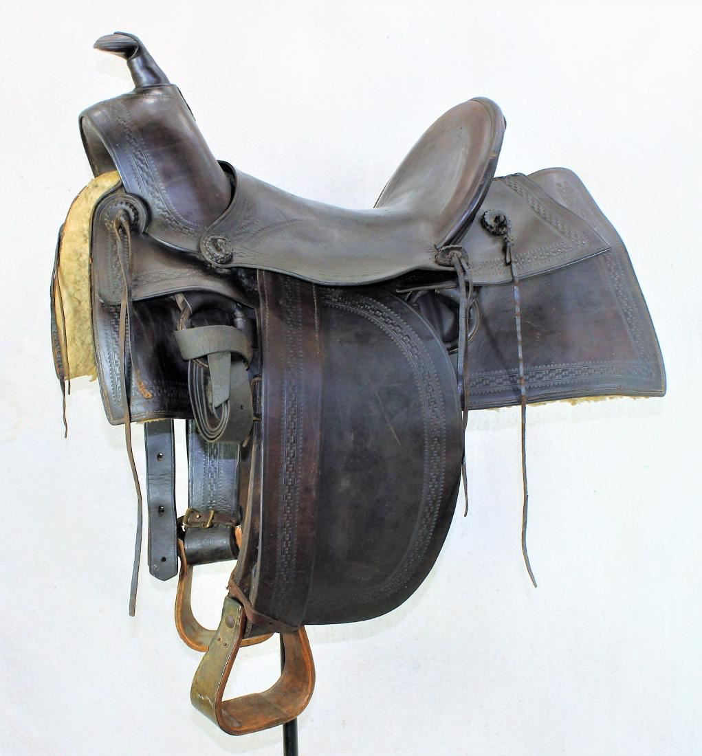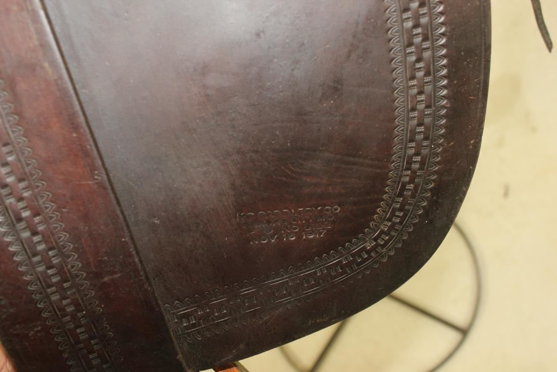 Wonderful 1909 US Cavalry saddle with slickfork front end, high cantle with pouch, square skirts, and great wooden stirrups.