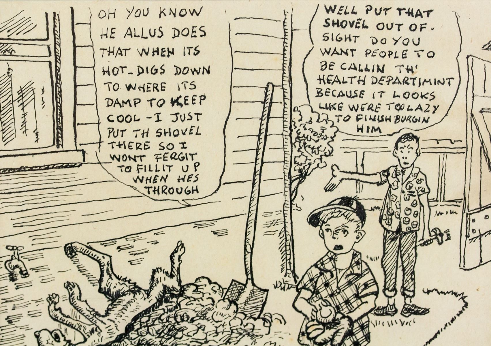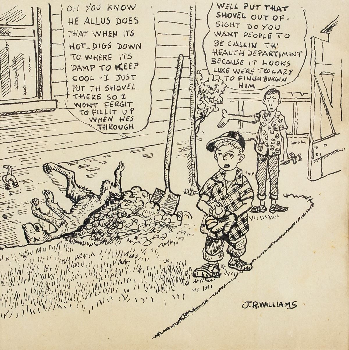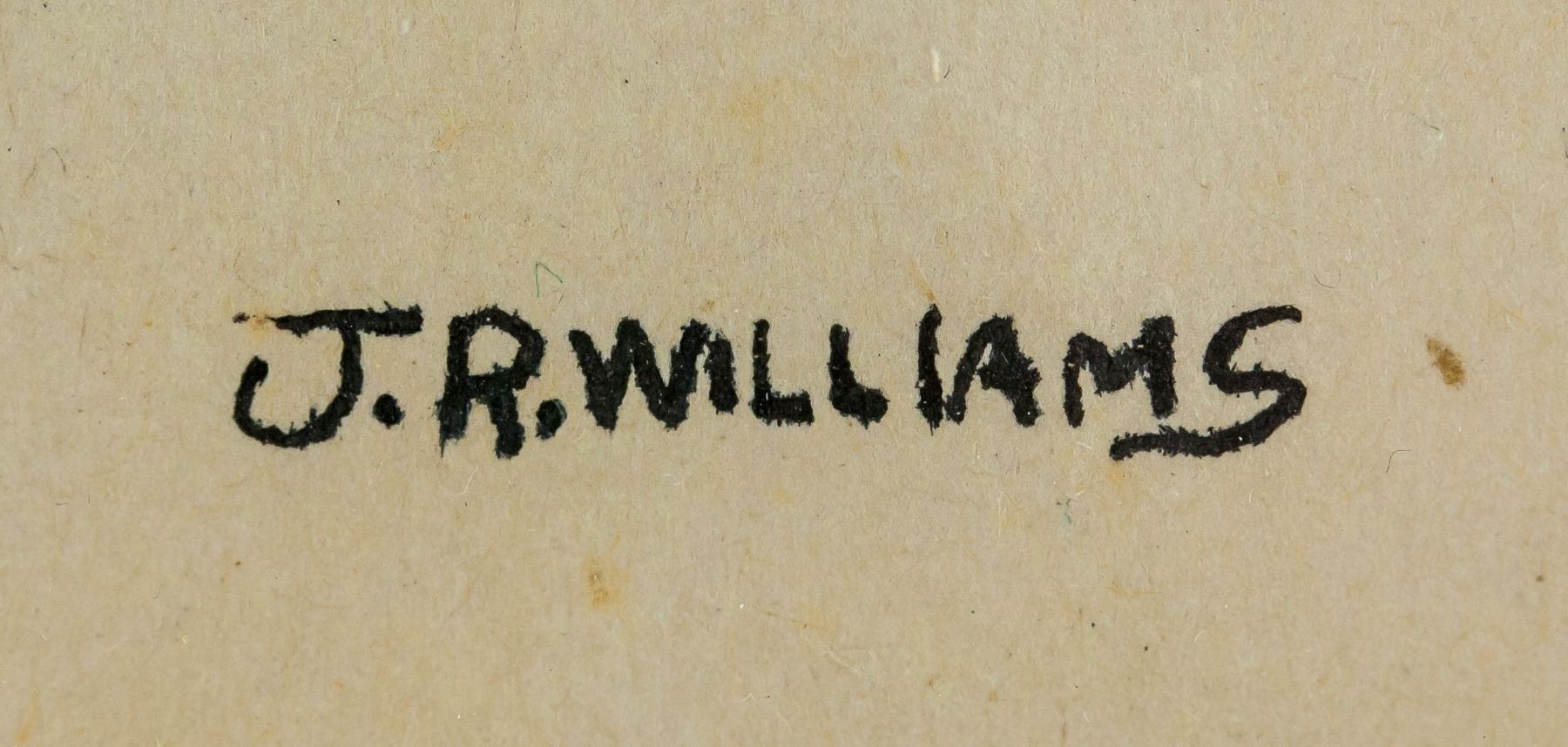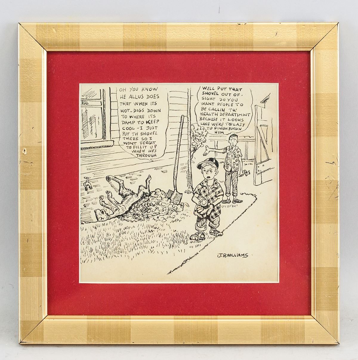 Ink on paper, framed. Featuring a comic sketch. Signed J.R.WILLIAMS on the lower right corner. Verso dated 1920. 14.5 x 15 cm (5.7 x 5.9 inches). Frame size: 24 x 24 cm (9.4 x 9.4 inches). Provenance: This lot carries limited provenance from a Southern Ontario estate