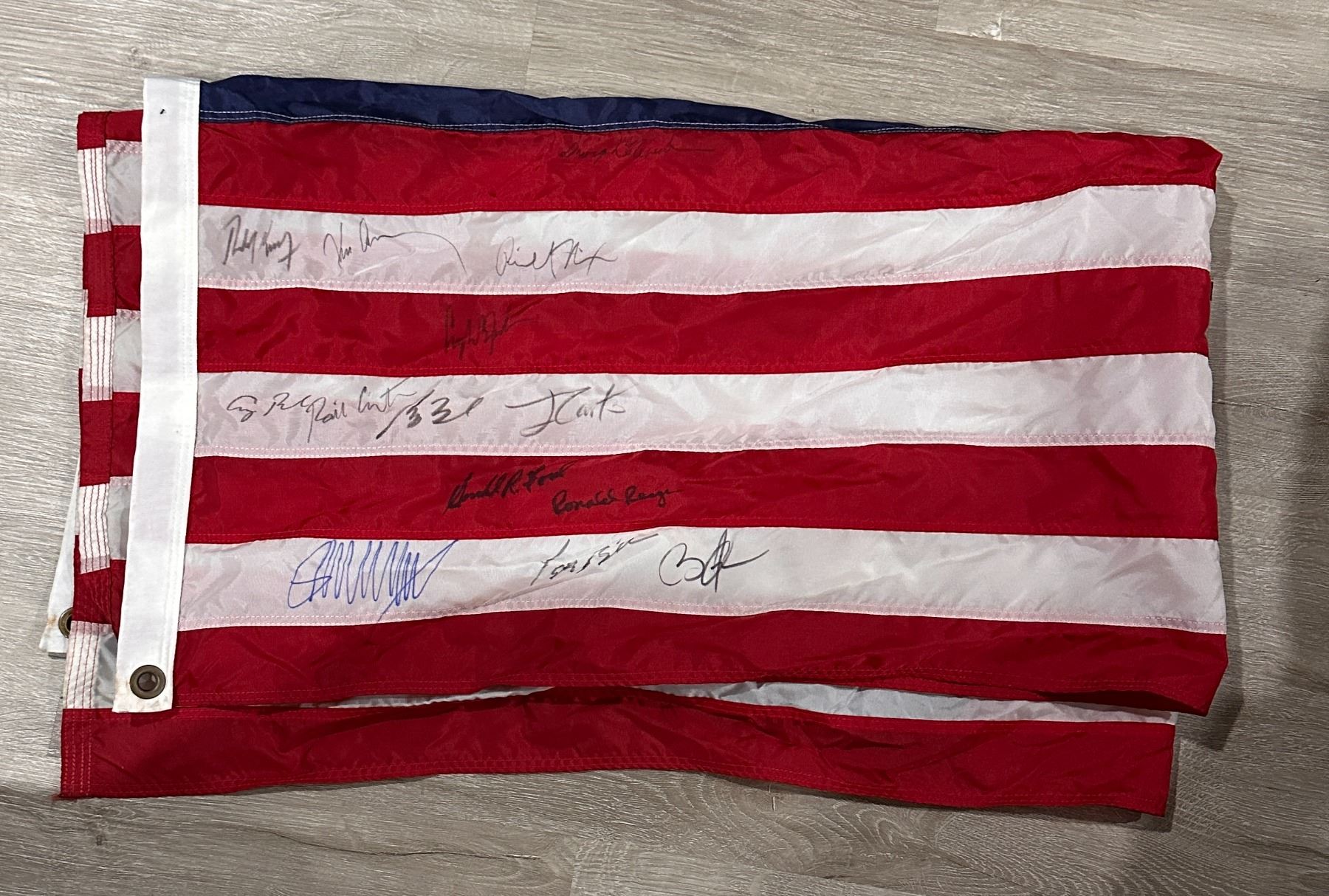 RARE HUGE 3X5 FT FLAG Signed by RFK JFK NIXON BUSH SR AND JR CARTER FORD REAGAN BIDEN OBAMA TRUMP AND EISENHOWER. Displays are not framed! They can be for a extra fee. Please reach out for cost. All items are described accurately. All items come with a coa we use numerous different companies. We will post the picture of the COA in the auction listing. For Premier Authentication items,we submit alot of items to them and we do not get the coa's for 3 -4 weeks. That is why the coa picture is blank. Your coa will come completly filled out with all the information on your item. All sales are final! We make no guarnetees that the item will pass other Authentication services resale value or ability to sell on other marketplaces! Please ask all questions before bidding not after. We have a few different of the piece advertised and you may or may not get the exact item pictured,please contact and ask for more details.