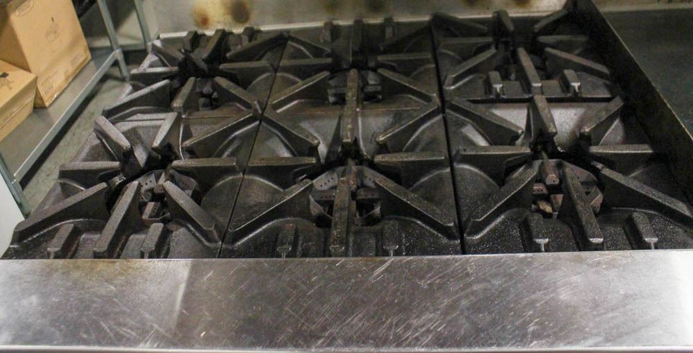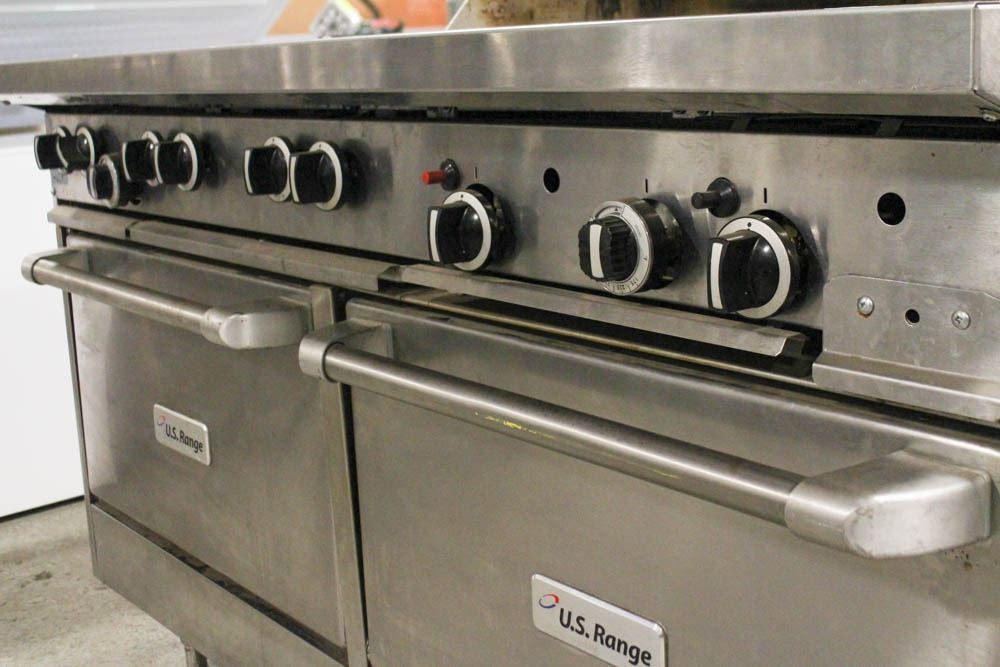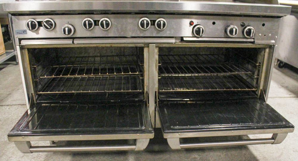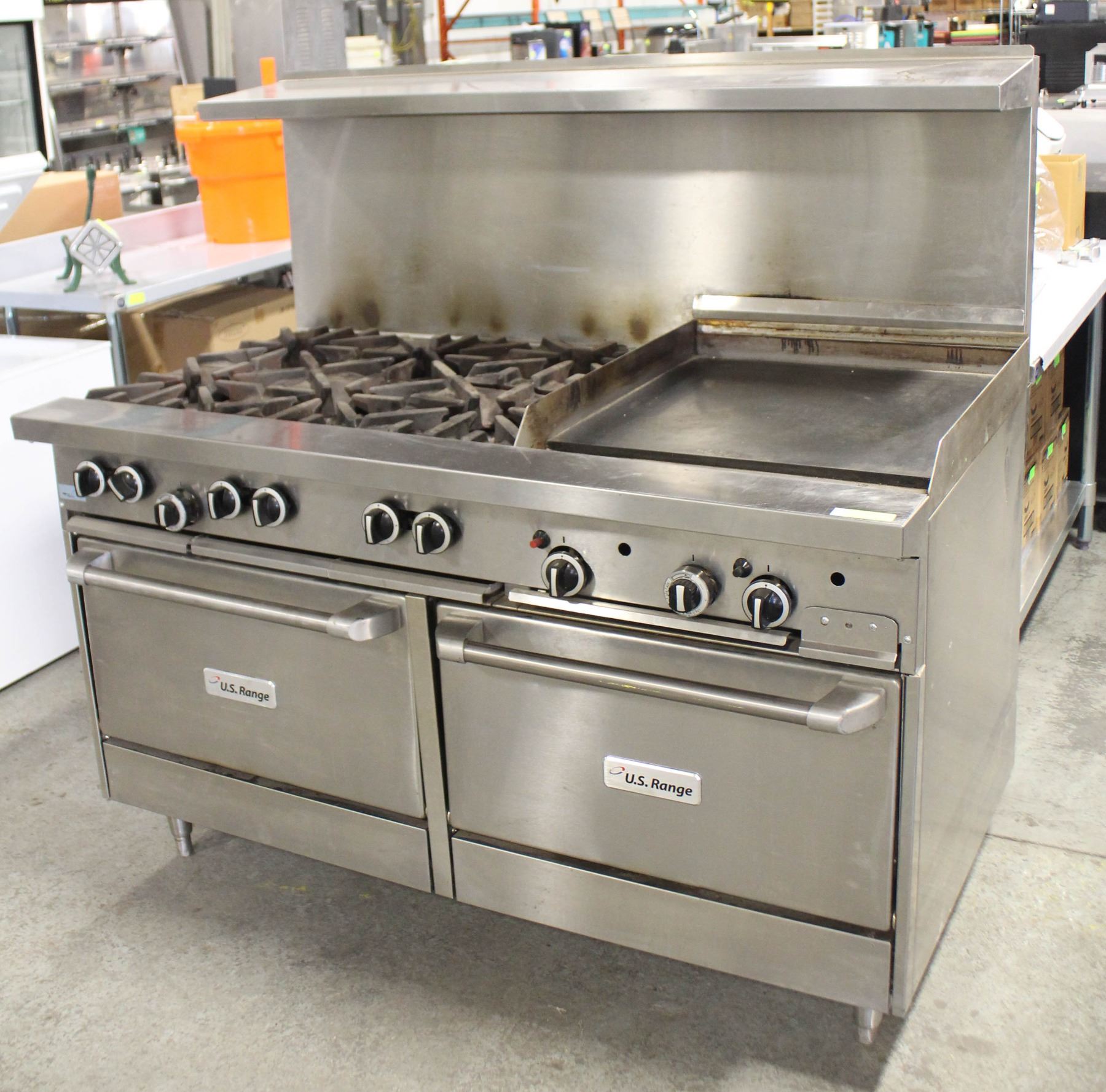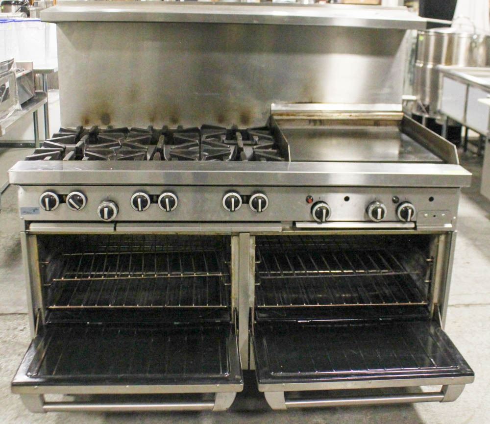 6 BURNERS, 24" GRIDDLE & 2 STANDARD OVENS. MODEL: U60-6G24RR. 304000 BTU/HR TOTAL. 32000 BTU/HR PER BURNER, 32000 BTU/HR PER OVEN. 48000 BTU/HR GRIDDLE. NATURAL GAS. 59.25" X 34.5" X 36"