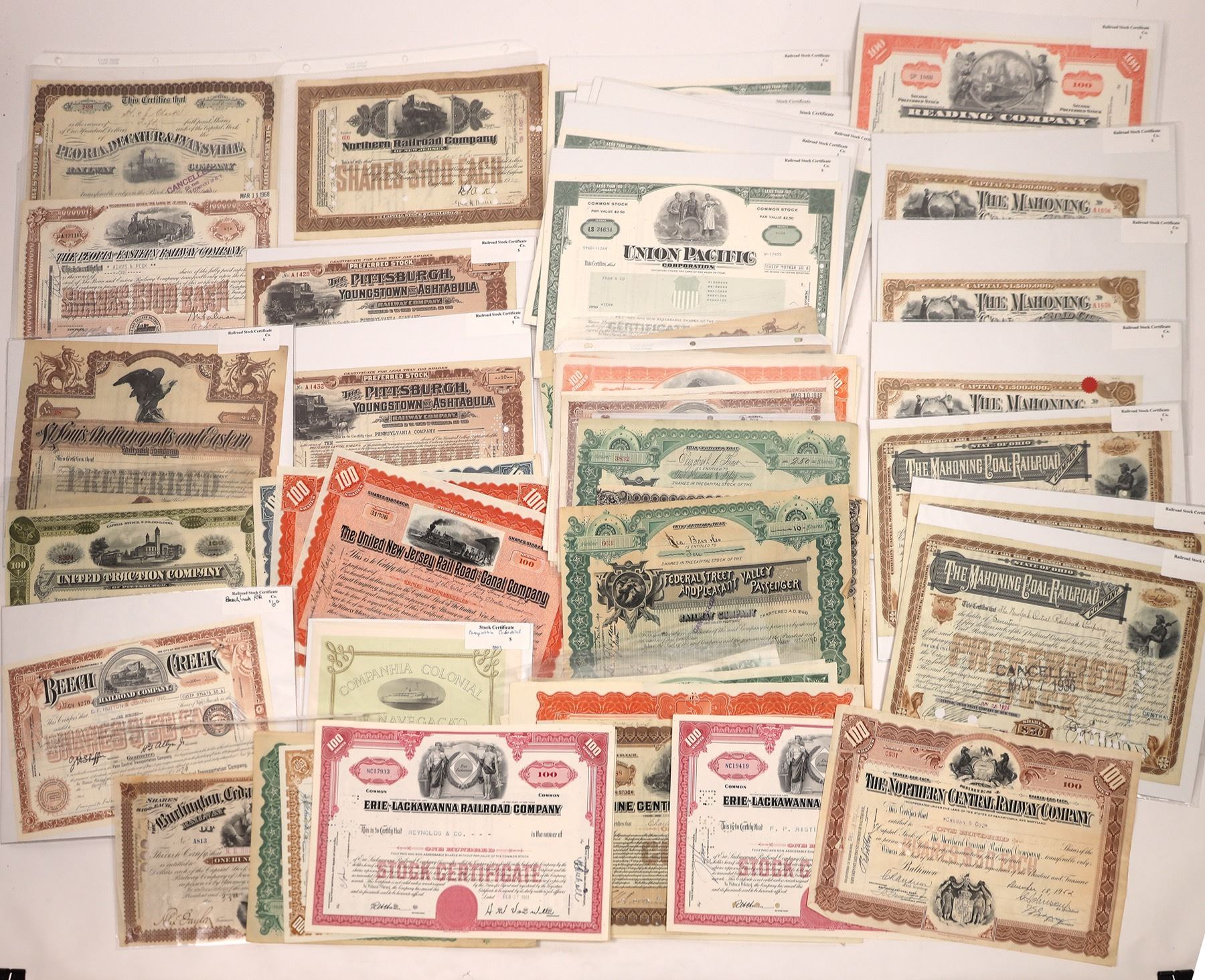 About 50 US railroad stocks. Mississippi and Missouri. Nodaway Valley. About 6 Missouri Pacific. 3 Beech Creek. Northern Railroad. 6 Mahoning Coal Railroad. 2 United New Jersey RR and Canal. United Traction. 7 Union Pacific. Norwich & Worcester. Northern Central Railway. Allegheny Valley Railroad 1874. 2 Sharon Railway. Jeffersonville Rail Road 1849. 2 Union Traction. 2 Maine Central. And more. City: State: Date: