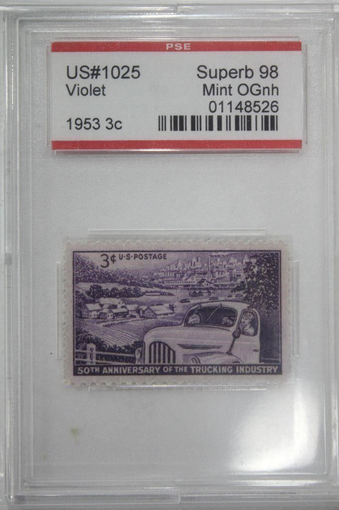 US SC#1025 3 Cent Violet Trucker OGNH PSE98. The 50th Anniversary of the Trucking Industry is a very popular issues. Slabbed PSE98