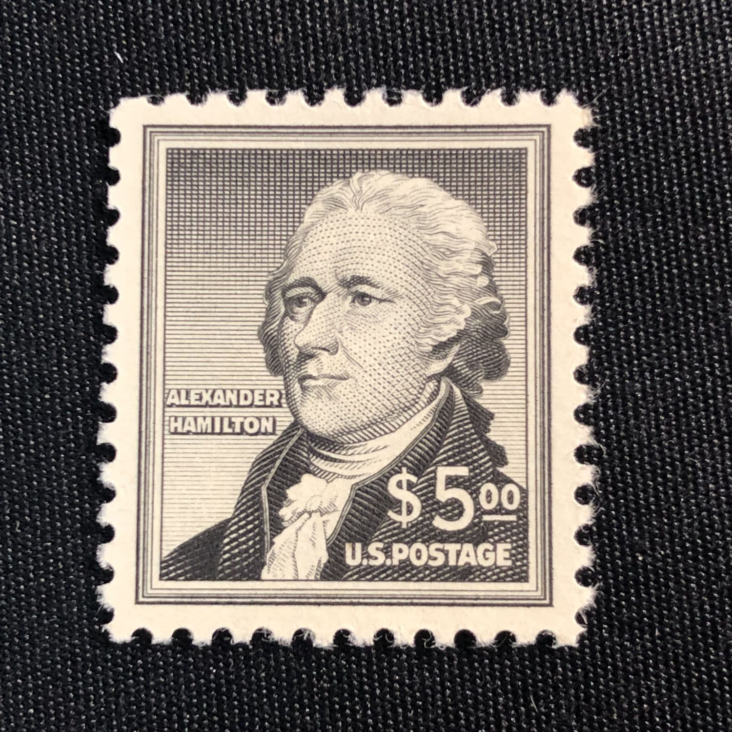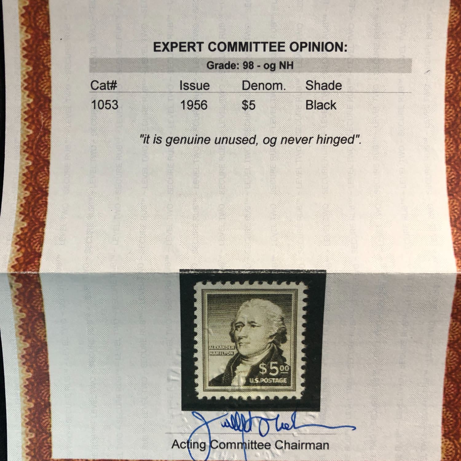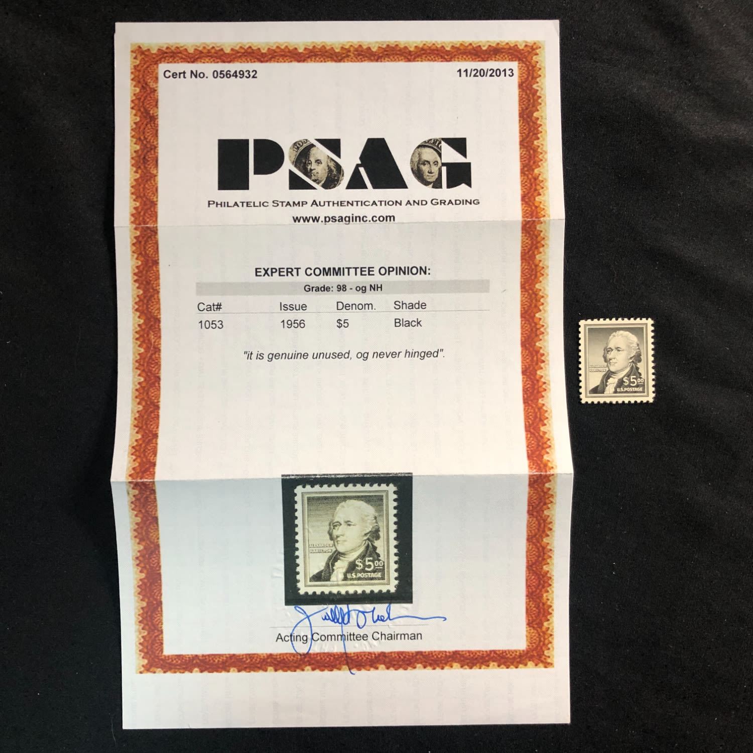 A Gem US SC#1053 1956 $5.Hamilton Issue Mint Graded Superb 98 NH with PSAG Certificate. A superb issue with deep color and perfect gum. The high value stamps from the 1950's are very under-rated. Great investment quality stamp!