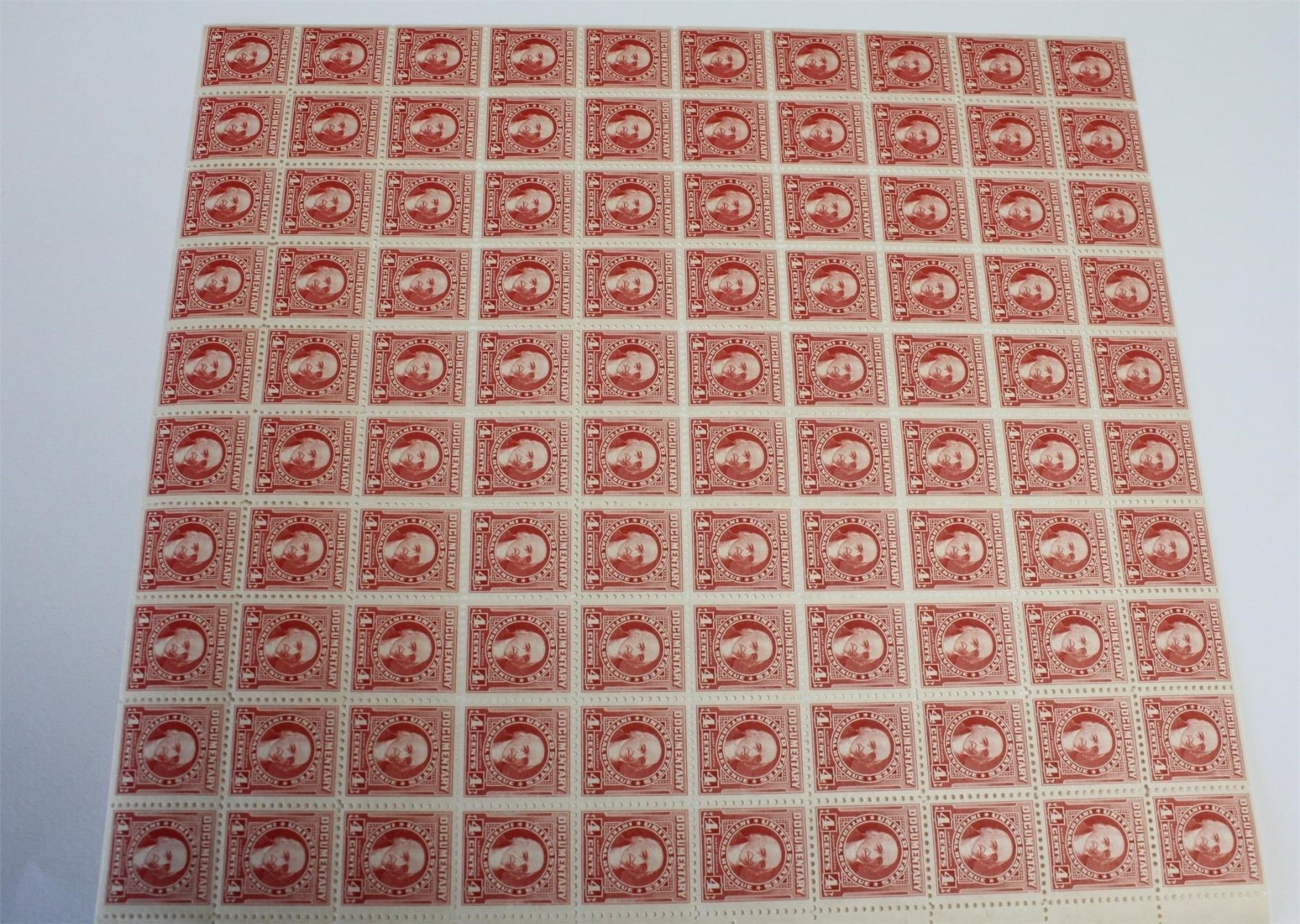A very bright and sharp 100 count sheet of these elusive SC# R657 4 Cent Documentary Stamps. A nice investment quality VF-XF sheet.