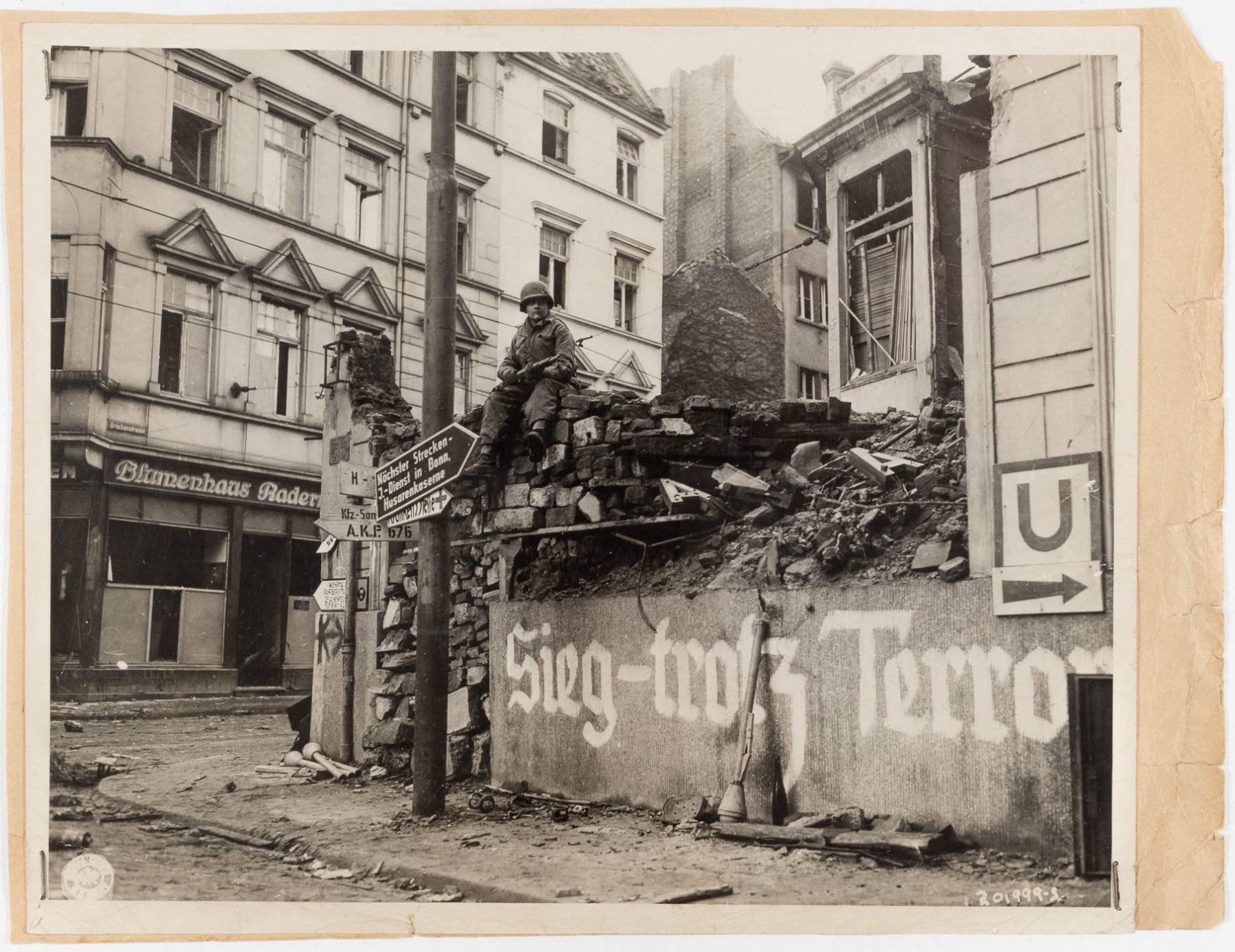 Terrific photograph, a 1945 snapshot of an American soldier sitting on a pile of German rubble on a street corner in a German city (possibly in Cologne since a sign points towards Bonn), below him are piles of discarded Panzerfaust tubes. The wall below him says 'Victory Despite Terror'. Photo is stapled to paper. 8.25 x 11 inches. Very good.