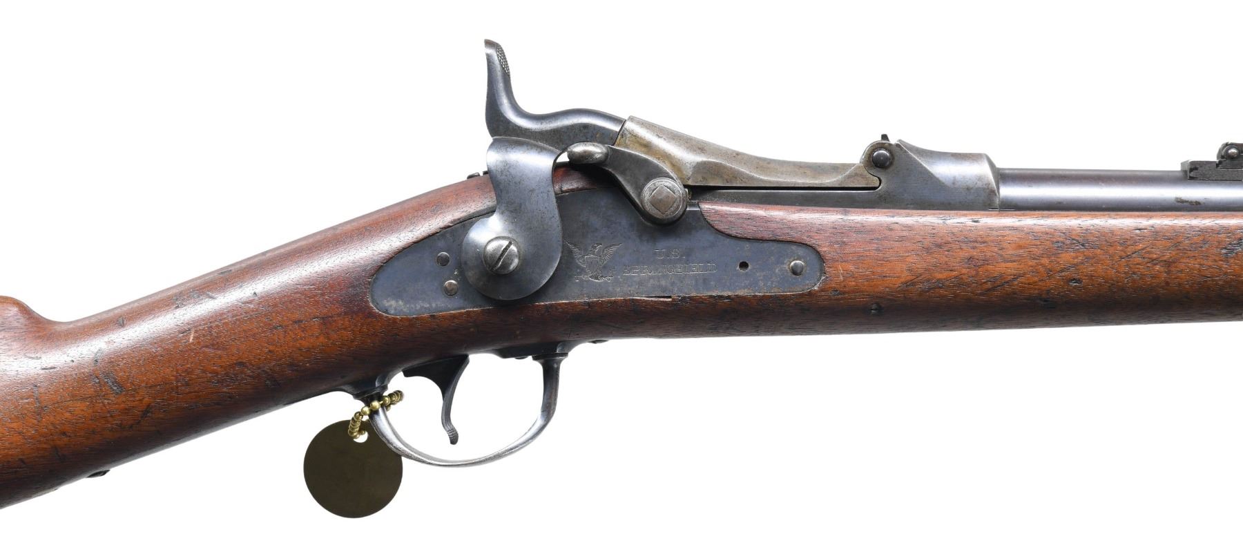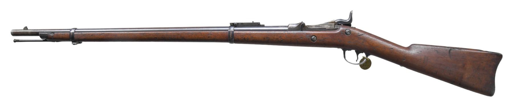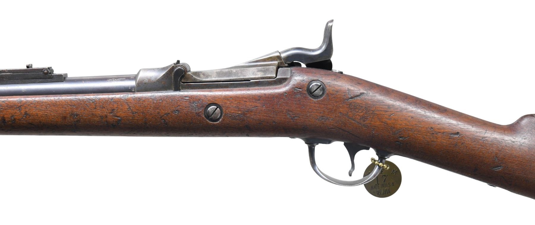 Cal. 45-70. S# 440175. Bbl. 29 1/2". Blade front sight. Buffington rear sight. Breechblock marked "US MODEL 1884". Blued & case colored finishes. Walnut stock with faint 1889 dated cartouche on left side, a faint white paint rack number & a white painted "9" both on right side of butt. Only one stacking swivel present, no sling swivels present. Brass tag around trigger guard that reads "WFM/17/MADE IN USA/WM" possibly from museum or other collection. Ramrod present. UNATTACHED ACCESSORIES: M1873 socket bayonet with 18" blade, scabbard & worn "NGP" leather frog. Bayonet has traces of what appears to be an old reblue with scattered oxidation & pitting. CONDITION: stock shows a couple patches of paint splatter around lower tang, a few gouges, scattered dings, handling marks & a few small chips. Metal retains 30-40% blue & case colors with overall fading to gray, scattered edge wear, light dings & oxidation. Action functions properly when hand cycled. Bore shows some light pitting but strong rifling. PROVENANCE: Estate Collection of Nicholas Apergis (01-27482/MJC). ANTIQUE. $500-800.