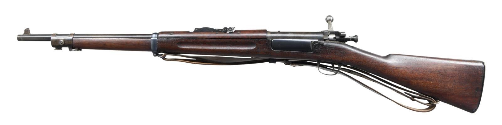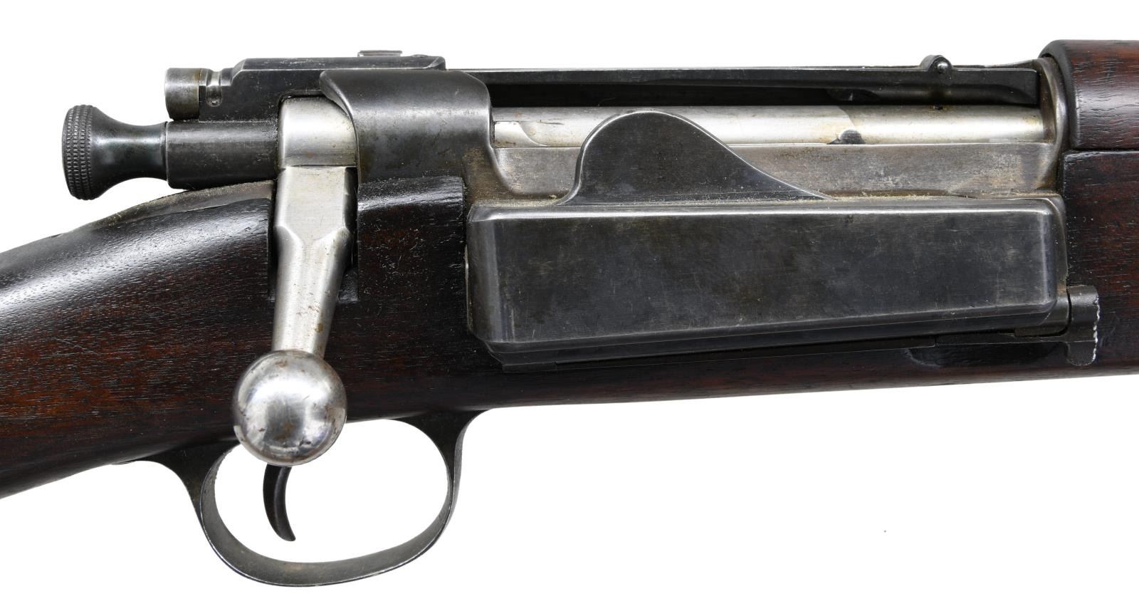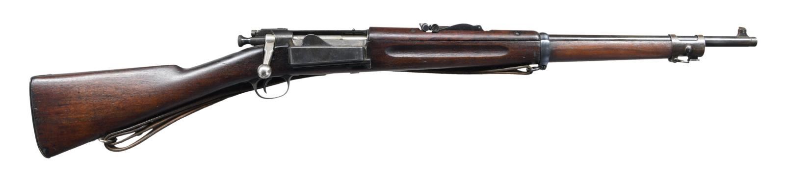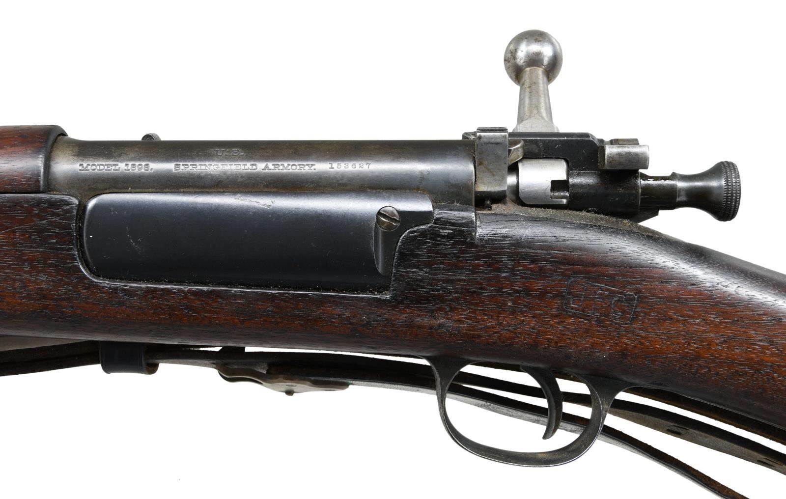 MILITARY RIFLE. Cal. 30-40 KRAG. S# 153627. Bbl. 22". Model 1902 tangent rear sight graduated to 2,000 yards. Blade front sight. Many surplus Krags were shortened to provided a lighter, handier rifle for schools and military academies as was this example. The bbl. has been shortened & the muzzle turned down to accept the bayonet muzzle ring. The forend was shortened & a walnut plug fitted to close the lightening cut. The original front sight has been reattached to the bbl. Walnut stock & hand guard. Stock is marked on left side over trigger guard "JFC". Circle "P" script proof under grip as well as "80". Forend tip has tiny "S" on filler piece. Smooth trap buttplate w/ curved toe. Original brown leather Krag sling. Markings include "A.B.LAIDELY SUB INSPECTOR U.S. ORD. DEPT" in oval. CONDITION: stock has vintage professional refinish leaving markings largely in tact but with moderate staining & handling marks. Sm. crack behind sideplate & at receiver tang. Missing chip between bolt handle & loading gate. Buttplate does not fit well & is likely a replacement. Metal has 50% of a professionally refinished blue w/ wear & scattered peppery oxidation. Good shiny bore w/ lightly worn lands. (23-2029/RW). MODERN. $400-600.