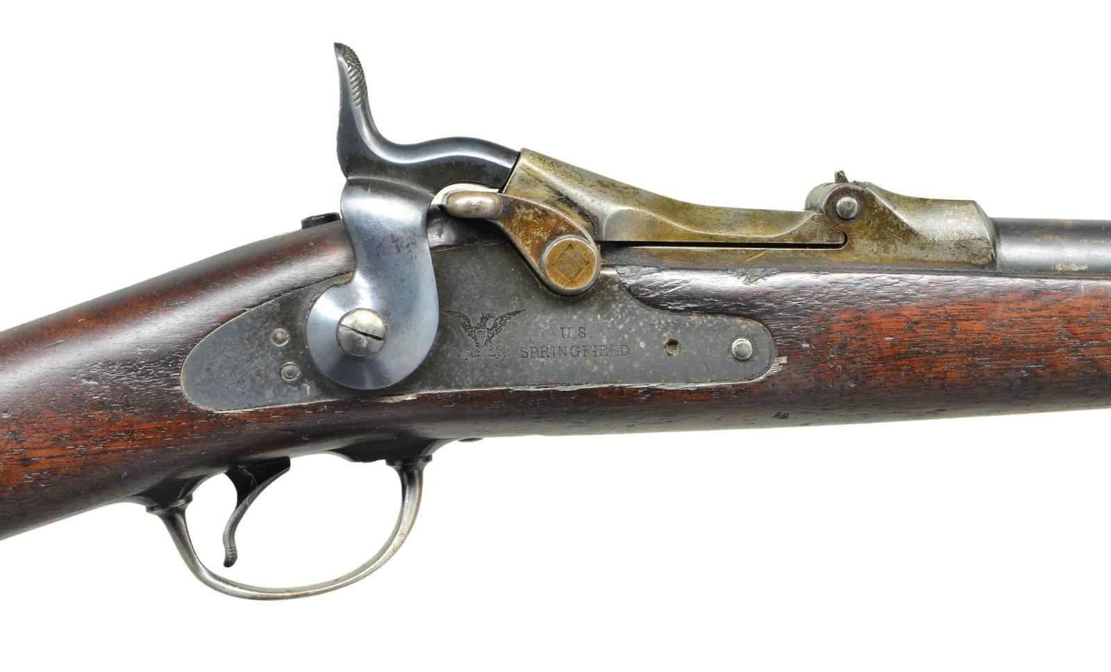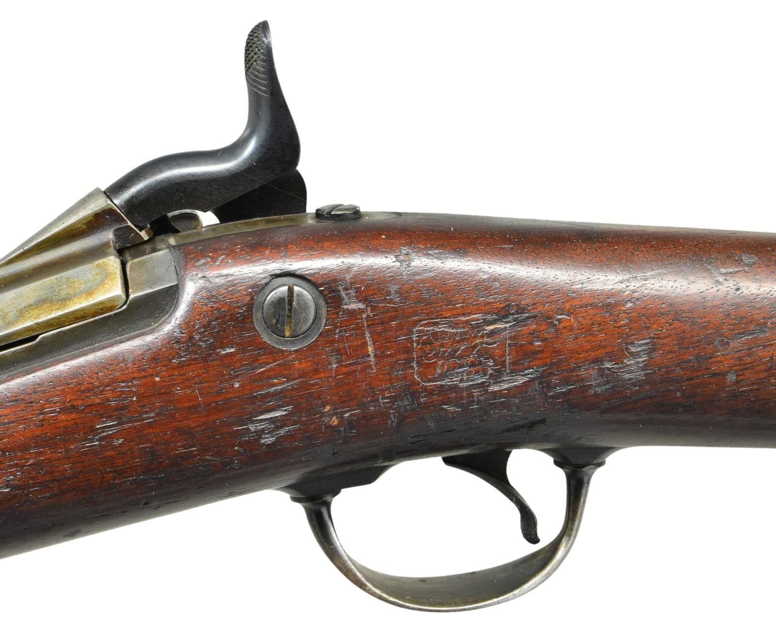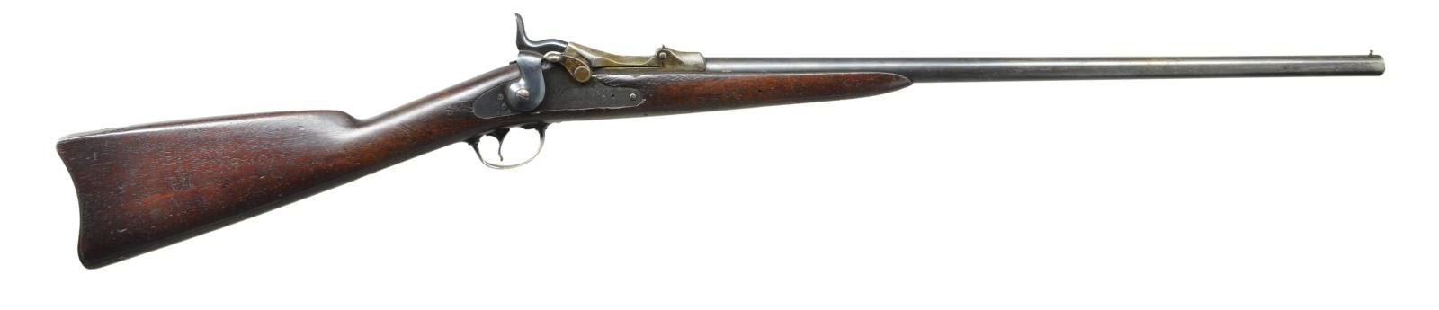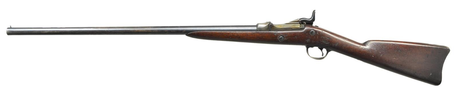 SHOT SHOTGUN. Cal. 20 ga. S# 1348. Total of 1,376 were produced for use by government hunters and scouts at western military outposts at the rate of 2 per company. Last known issue was in Alaska in 1906. Bbl. 26" unmarked round with 3/16" high brass front bead. Model 1879 action with 1881 dated low arch case colored breech block. Sporter style stock is fashioned from cut down Civil War musket stock. Left side has a "SWP" cartouche with 1885 date. Toeline of stock has circle "P" firing proof behind smaller indistinguishable marks. CONDITION: fine. Barrel, lock, hammer and bottom metal retain over 75% blue showing scattered wear and handling marks. Breech block and top tang retain small amounts of case colored finish. Original wood finish has age darkened worn appearance showing scratches, dents and marks. Bore is generally bright showing scattered spots of light pitting. (01-21451/DS). ANTIQUE. $2,000-3,000.