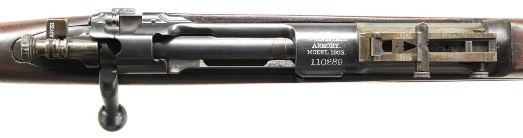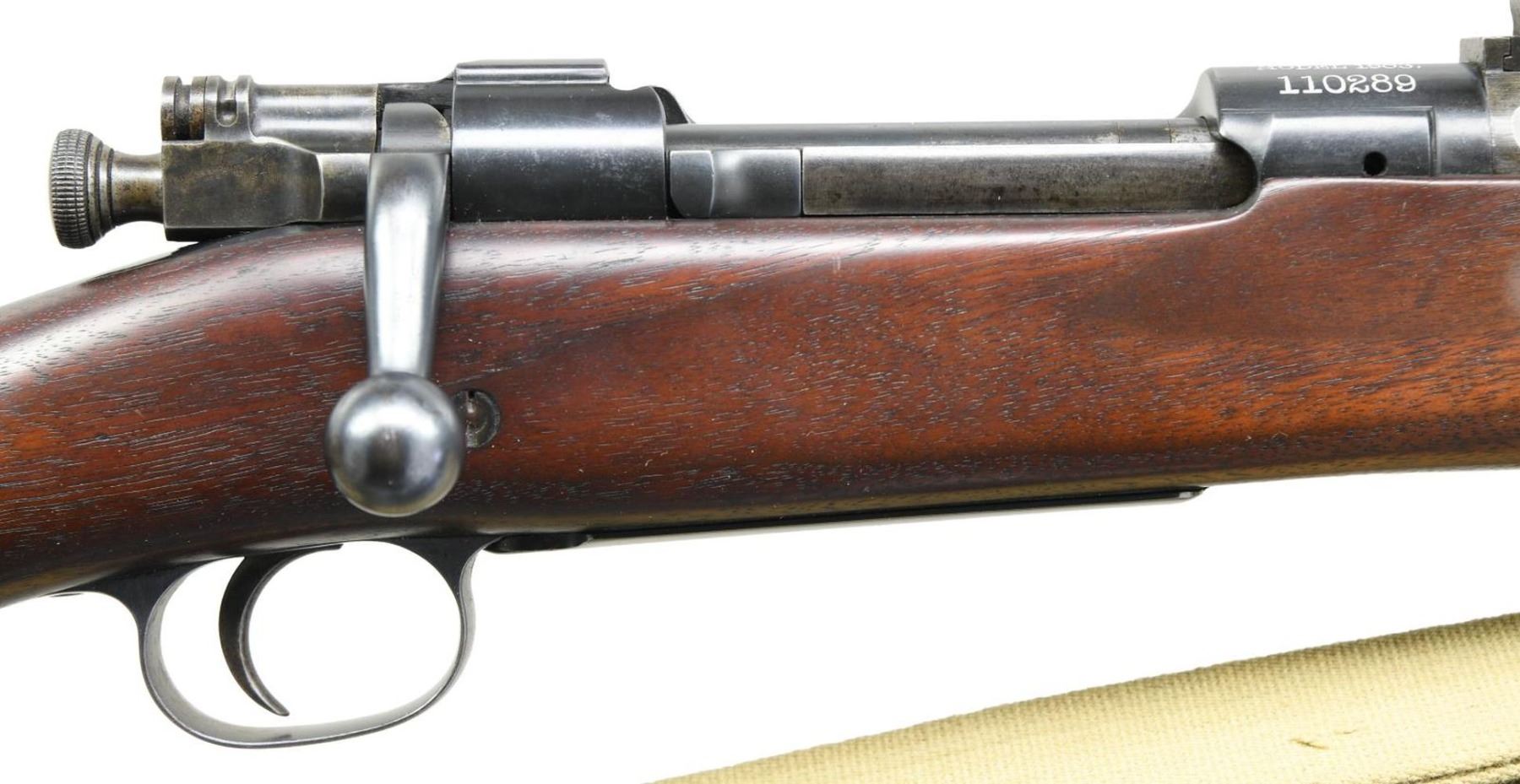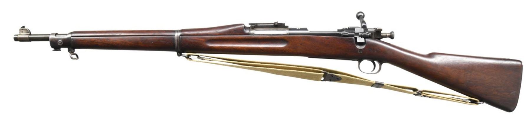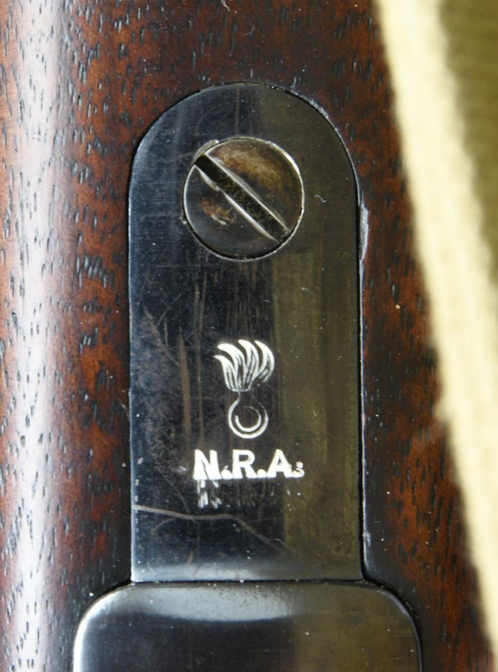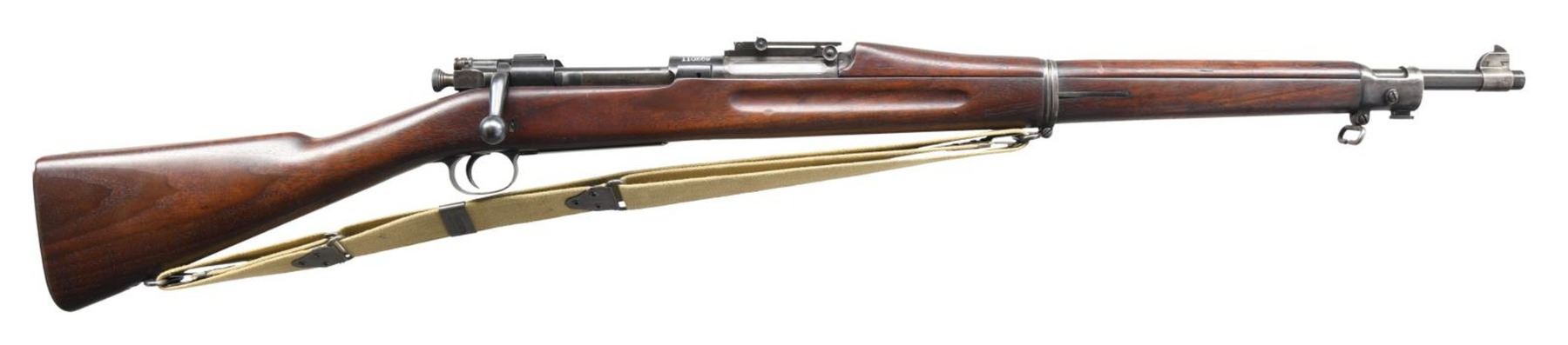 ACTION MILITARY RIFLE. Cal.30-06. S# 110289. This rifle has a serial number which indicates a mfg. date of 1906. The acceptance mark on the left side of the stock is a boxed "G.R.G. belonging to G.R. Goring who worked at Springfield Armory C. 1908-10. The bayonet stud is marked "H" for hardened which was added after 1908. The "N.R.A." & flaming bomb were used on the front of the trigger guard to denote private ownership when rifles were purchased from the "DCM". The 24" bbl. is a later replacement as it is from Rock Island Arsenal production & is dated "10-18". The ladder rear sight is graduated to 2850 yards & has a "volley notch". Grooved, dished windage & elevation knobs. Rear sight base is marked on left rear w/ encircled "S". Blade front sight. Straight down bolt handle. Marking underneath bolt handle root is indistinct. Marked "C" under safety lug. Extractor & bolt have gas escape holes. No "Hatcher Hole". All milled furniture including smooth trap buttplate & smooth narrow trigger. Straight grip walnut stock marked "S" at tip. Cutoff recess is unmarked. Marked "N" behind trigger guard. The circular proof is very faint. Early handguard w/out groove. Kerr "NOBUCKL" web sling. UNATTACHED ACCESSORIES: nickel plated oiler in butt. CONDITION: stock set has been refinished w/ some rounding of corners & slight loss of wood in protected areas. The metal except bbl., bands and sights has been polished, reblued & has light high point wear plus light handling marks. Markings are enhanced in white. Bore is shiny but w/ lightly worn lands. Muzzle gauges 1.0. (23-5720/RW). CURIO. $800-1,200.