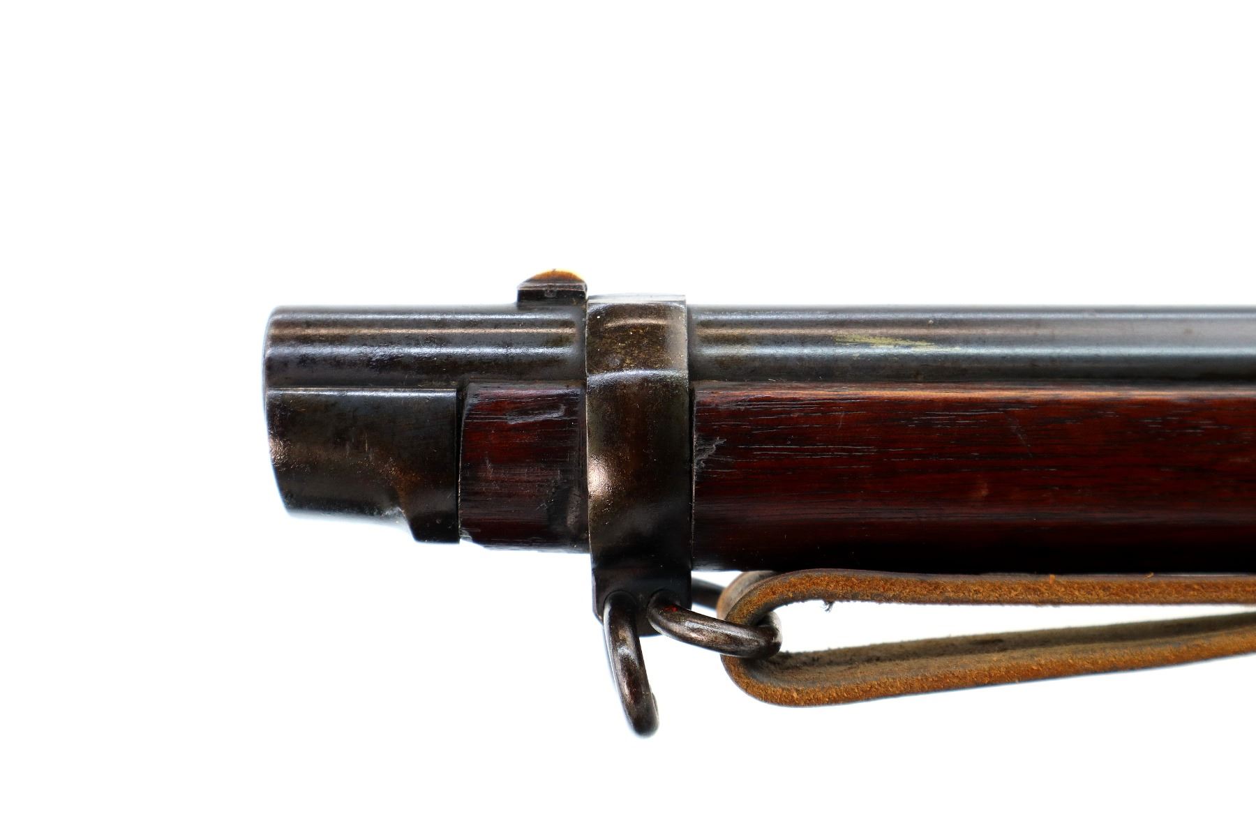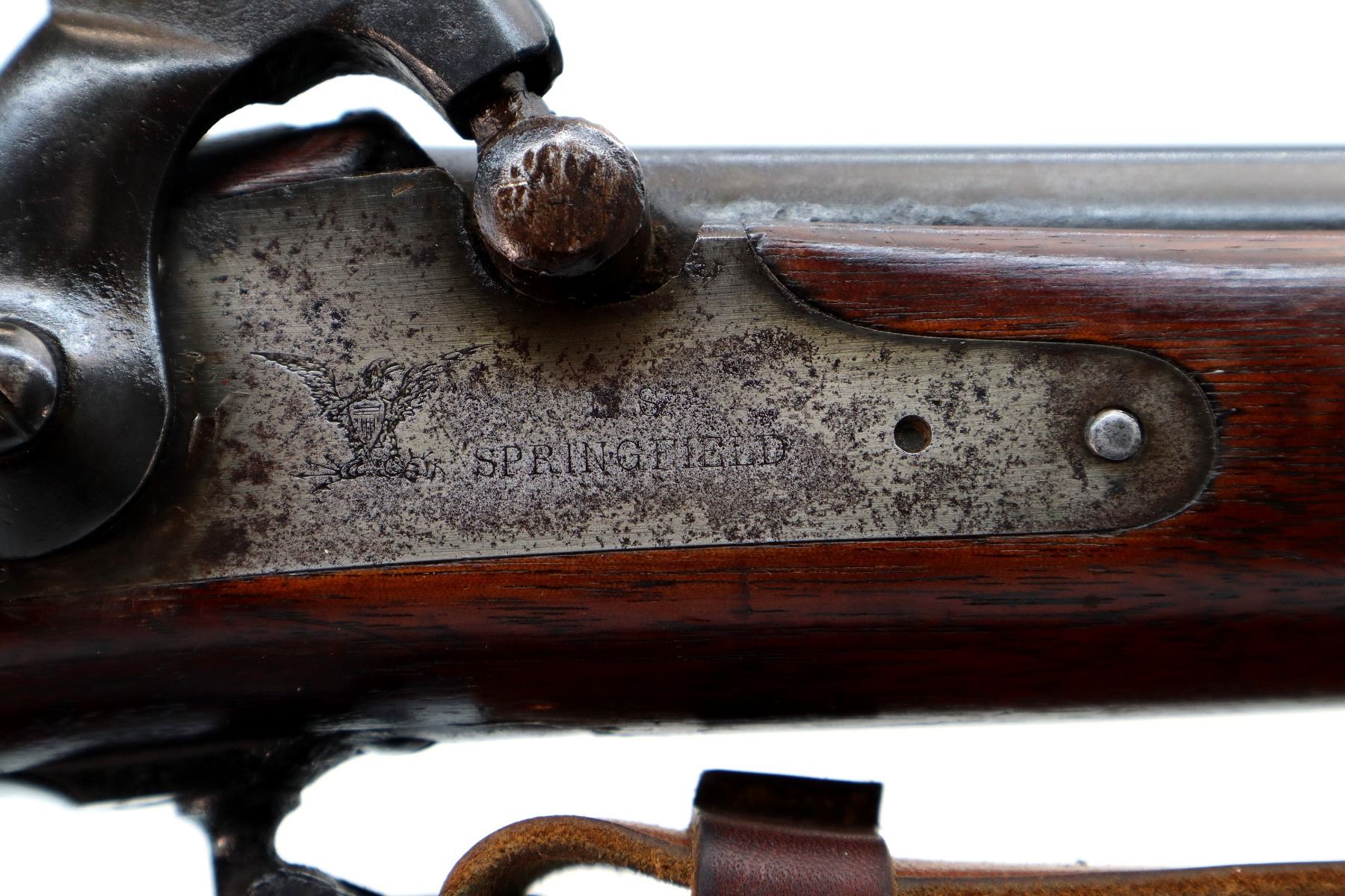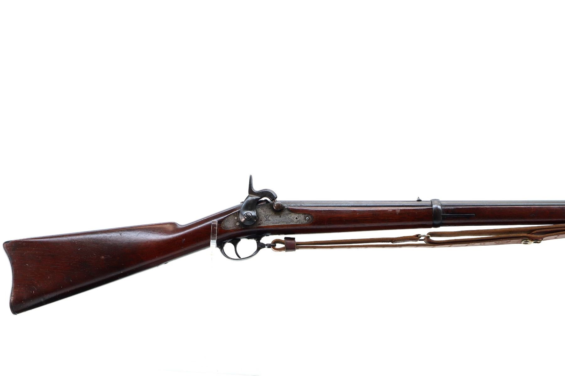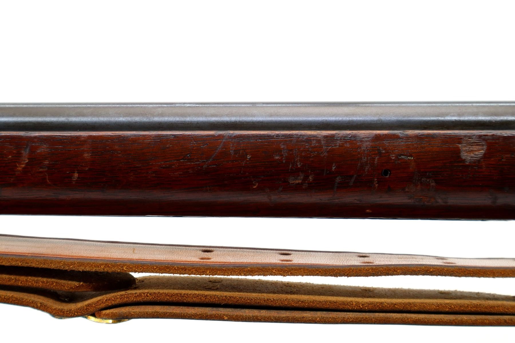 Main Description: This appears to be a custom built cadet rifle using a Springfield lock .45 CAL barrel, wood stock with lead bedding at the rear. White blade front sight with ramp, u notched rear sight, blued finish, tapered round barrel, lock has US Eagle, checkered spur hammer that functions, nipple is broken. One piece full military wood stock, straight grip, smooth steel butt plate, sling swivels with brown leather sling, missing cleaning rod.