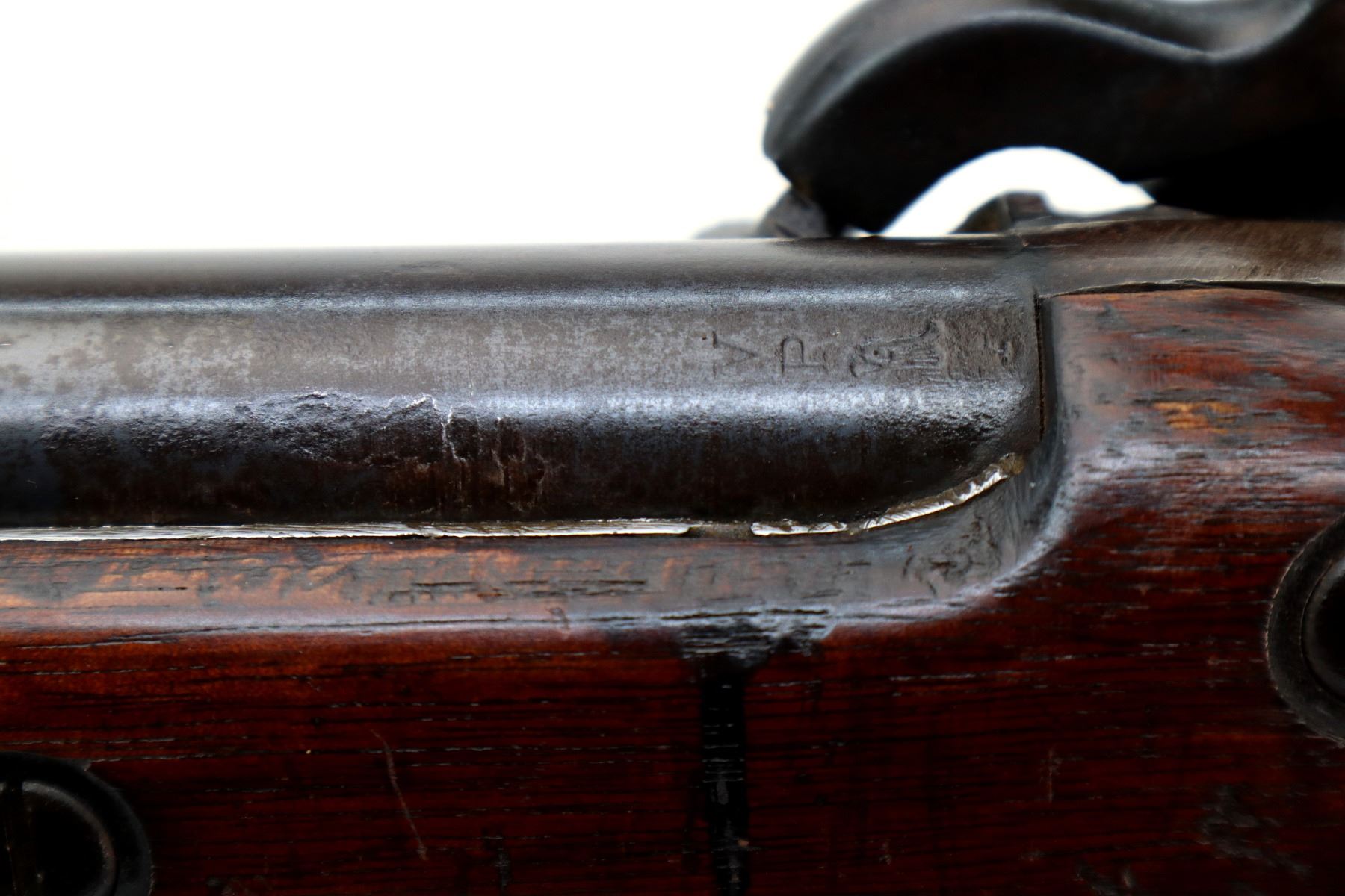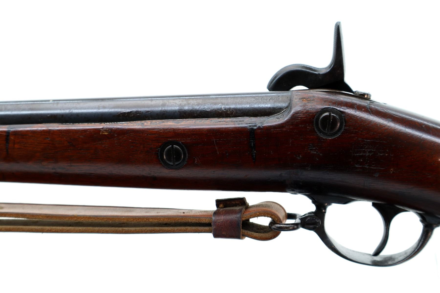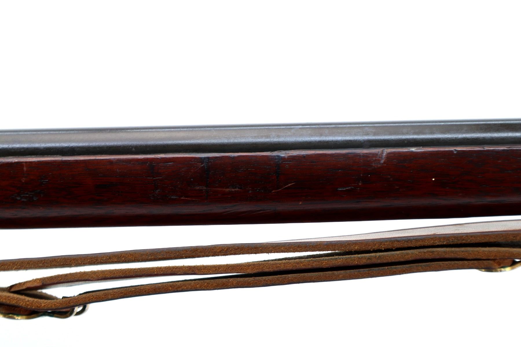 Main Description: This appears to be a custom built cadet rifle using a Springfield lock .45 CAL barrel, wood stock with lead bedding at the rear. White blade front sight with ramp, u notched rear sight, blued finish, tapered round barrel, lock has US Eagle, checkered spur hammer that functions, nipple is broken. One piece full military wood stock, straight grip, smooth steel butt plate, sling swivels with brown leather sling, missing cleaning rod.