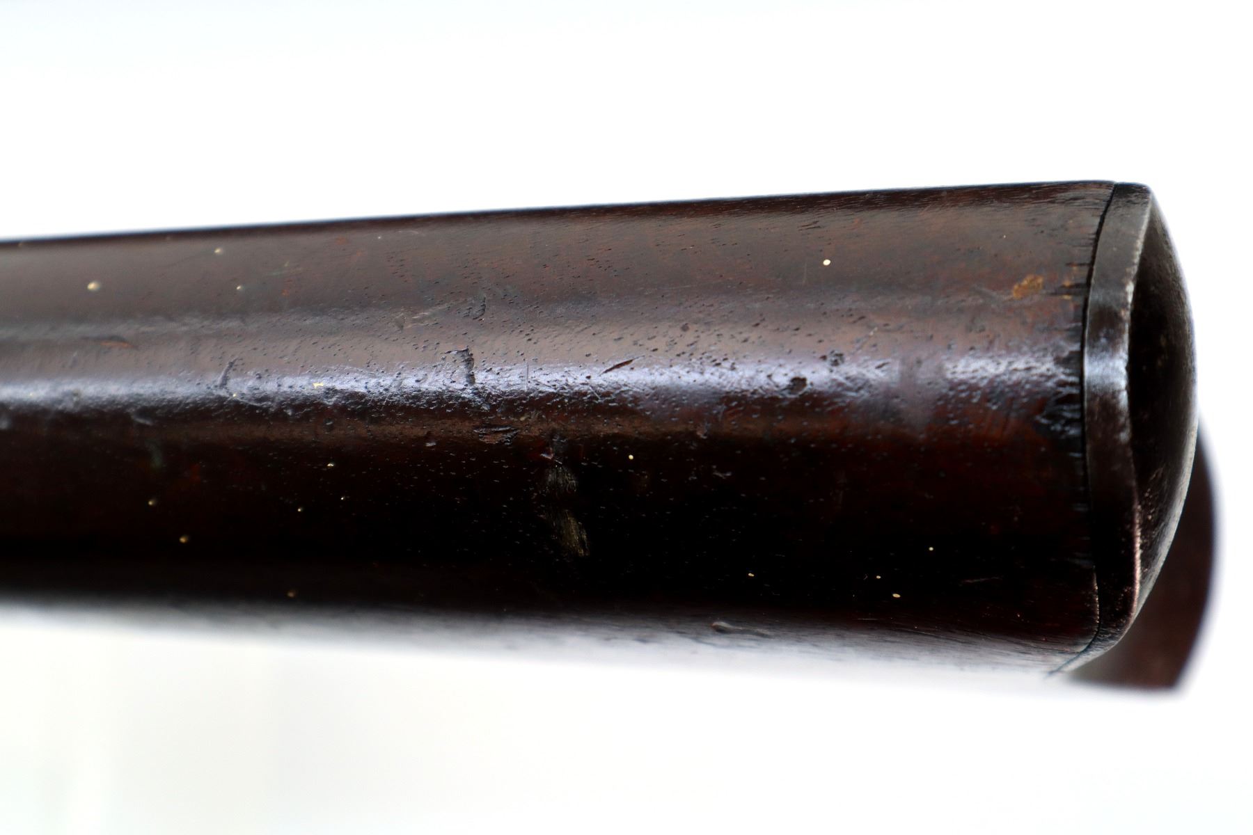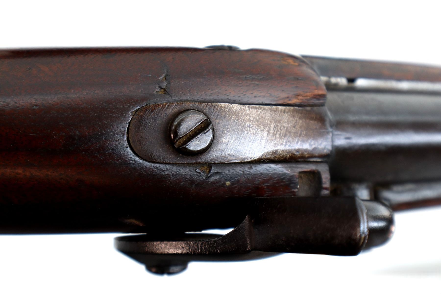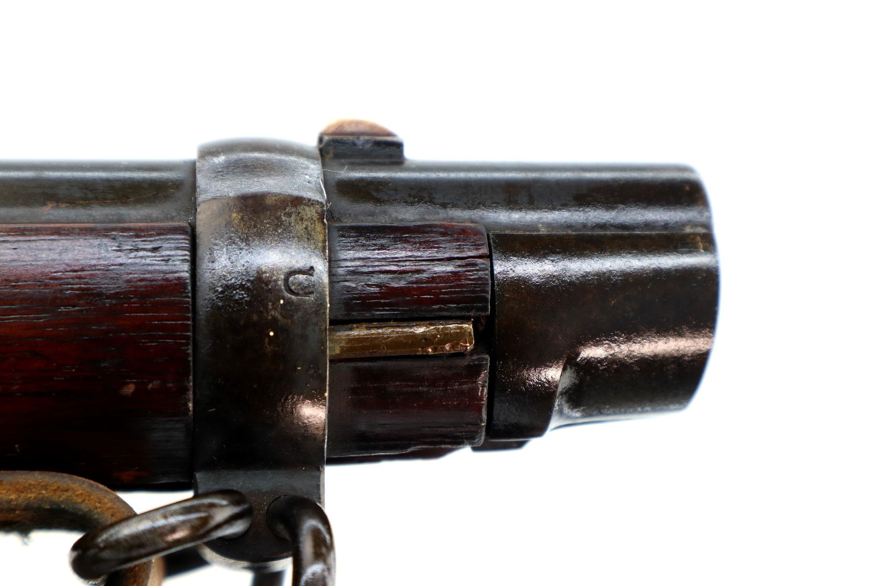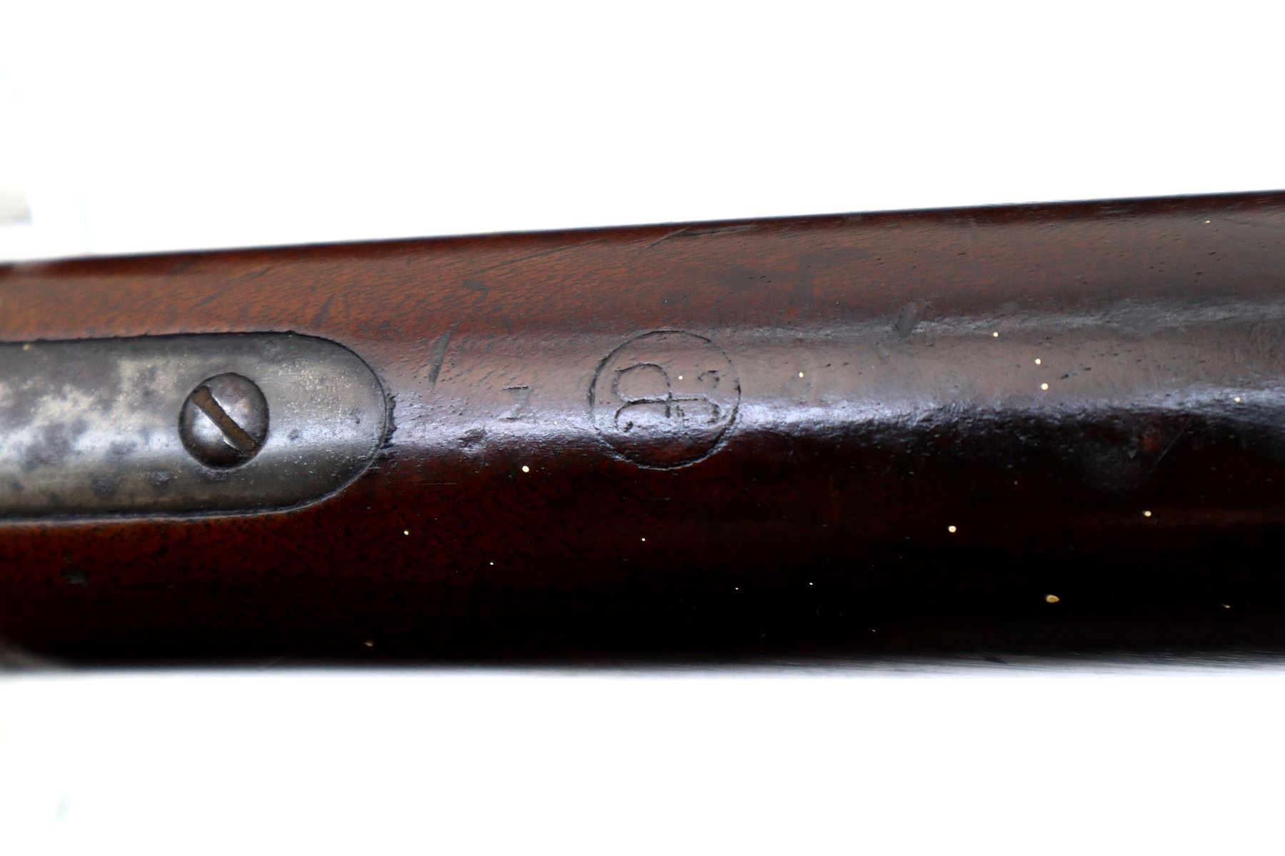 Main Description: This appears to be a custom built cadet rifle using a Springfield lock .45 CAL barrel, wood stock with lead bedding at the rear. White blade front sight with ramp, u notched rear sight, blued finish, tapered round barrel, lock has US Eagle, checkered spur hammer that functions, nipple is broken. One piece full military wood stock, straight grip, smooth steel butt plate, sling swivels with brown leather sling, missing cleaning rod.