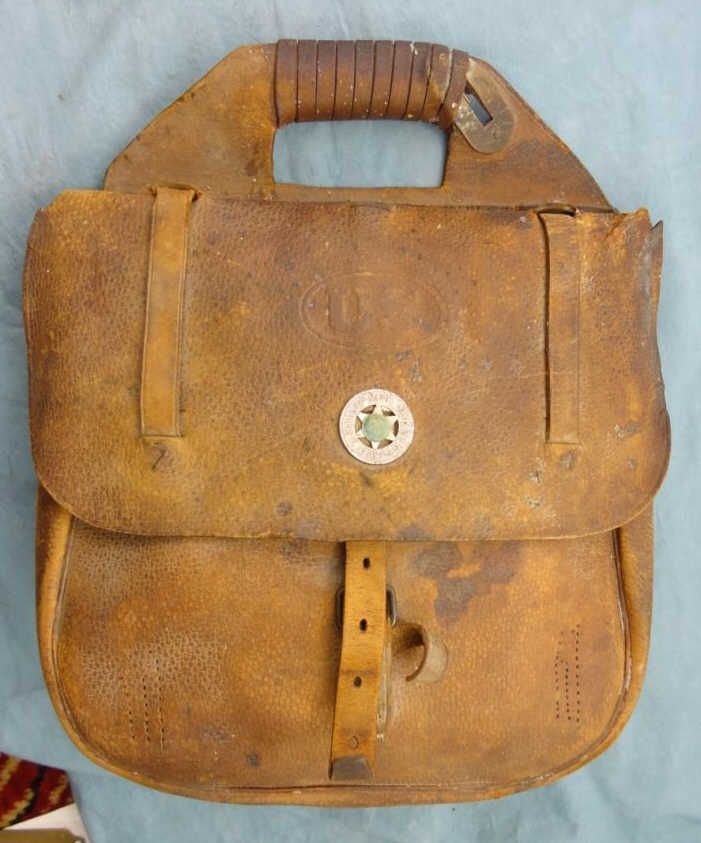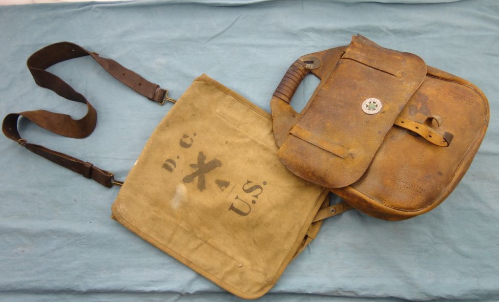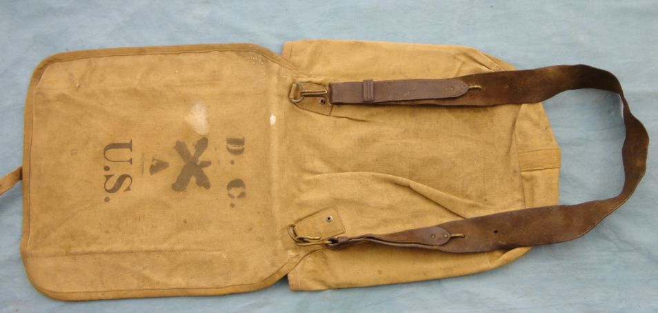 US marked saddle bag turned into a single carry bag w/Madison WI pin. Spanish American war over-the-shoulder bag in good condition w/original leather strap.