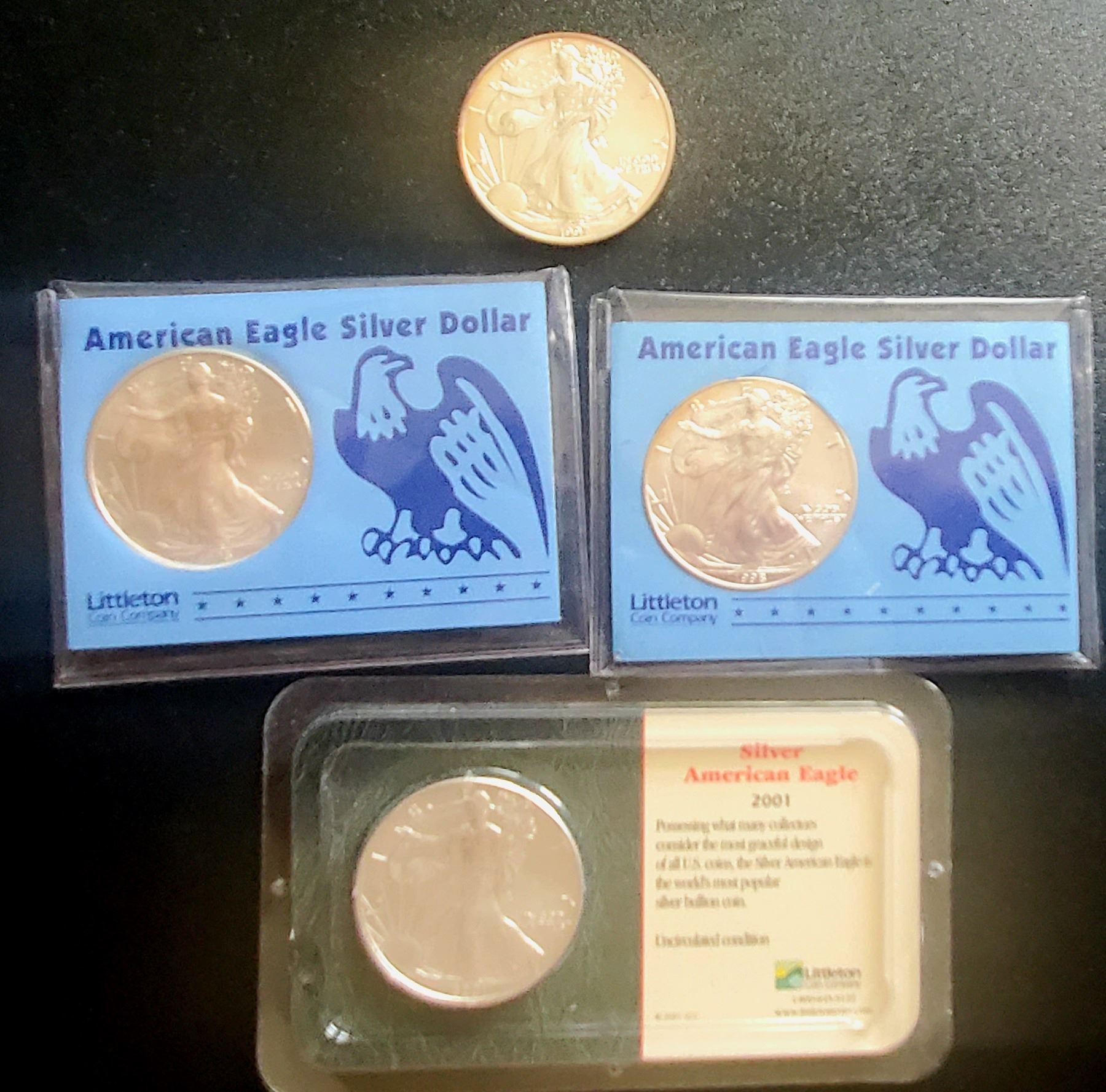 4 Silver Eagles, includes 1997, 1998, 1998 and an 2001. Uncirculated.