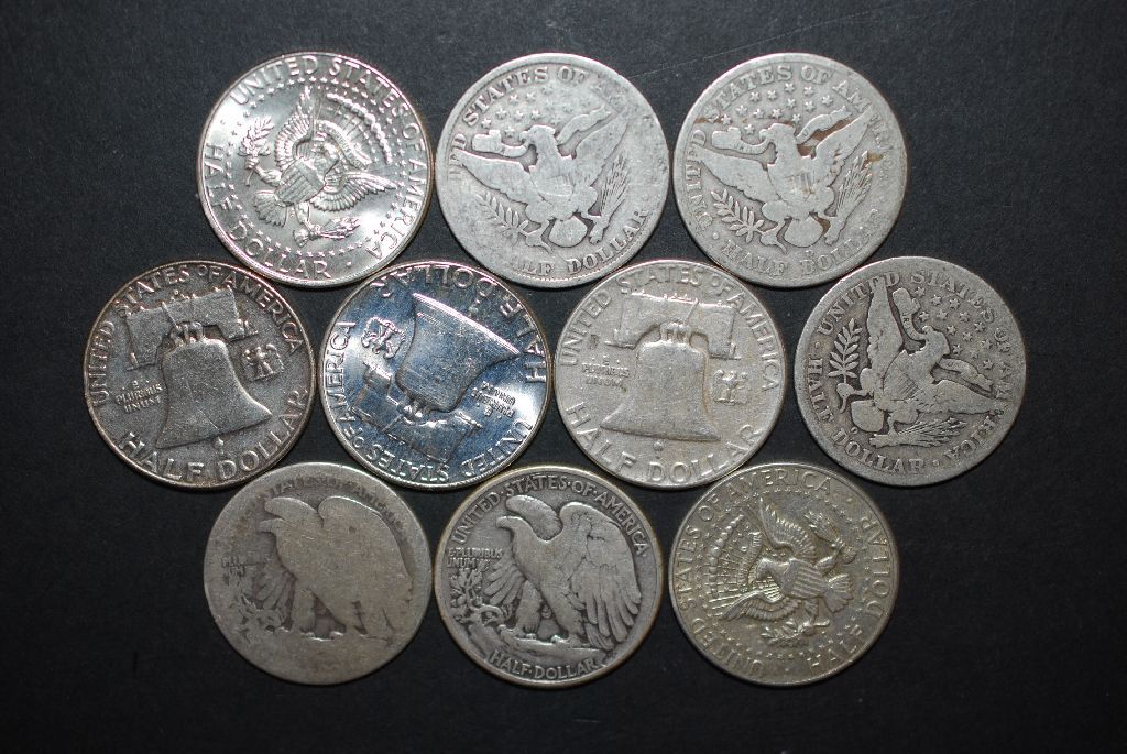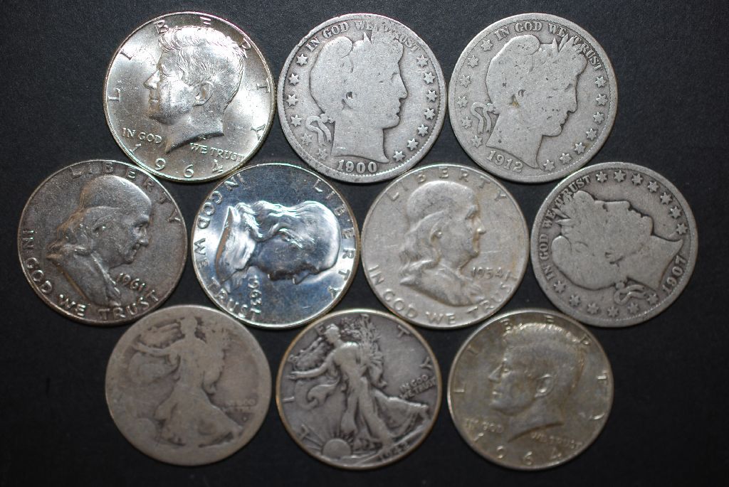 US Silver Half Dollars $5 Face Value; Various Dates, Conditions & Mint Marks; Lot of 10; EST. $125-150