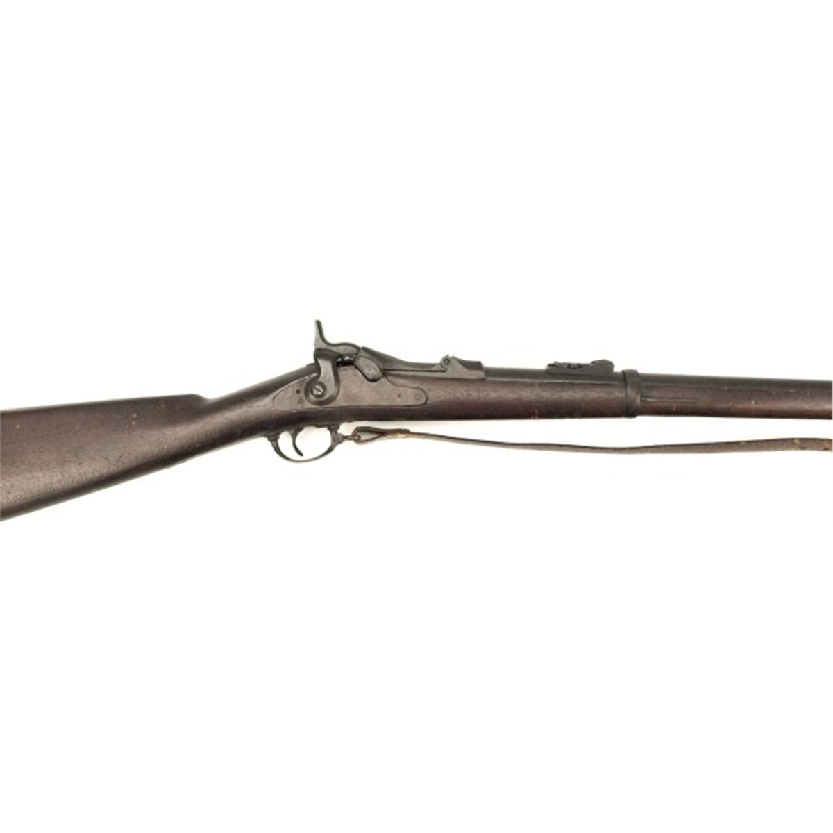 US Springfield Model 1873 .45-70 NVSN rifle 32 1/2" barrel, walnut stock with non original leather sling. All metal with deep dark brown patina, top of breech marked MODEL 1873 US, lock plate void of any markings, walnut stocks good showing scattered dings and dents, with bayonet. Firm action with dirty bore which should clean to good. NO FFL.