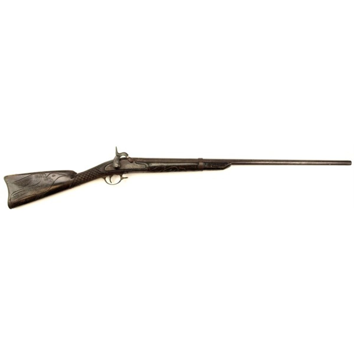 US Springfield percussion rifle .58 cal. NVSN 33" barrel and walnut stock. Barrel shows deep old dark brown patina, lock plate marked US Springfield and 1861. Stock shows old carving, functioning action. NO FFL.