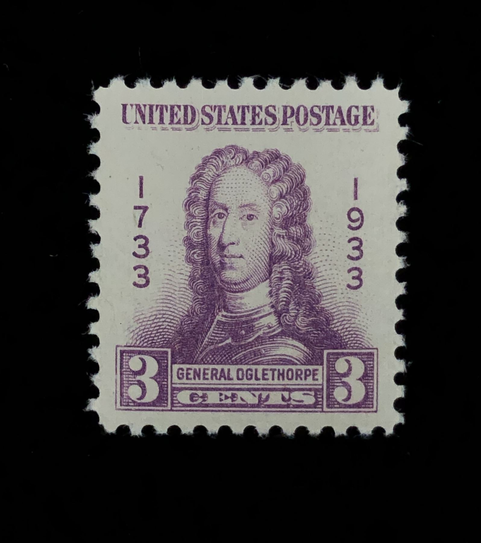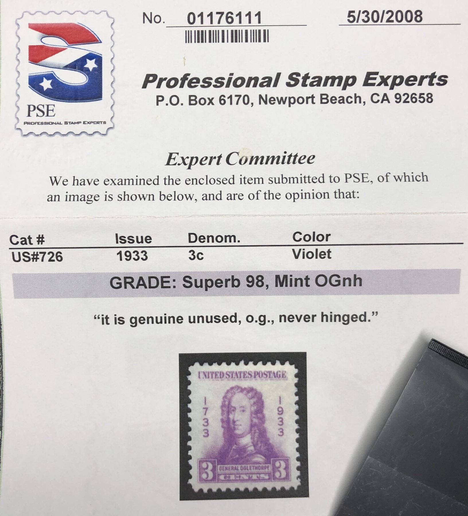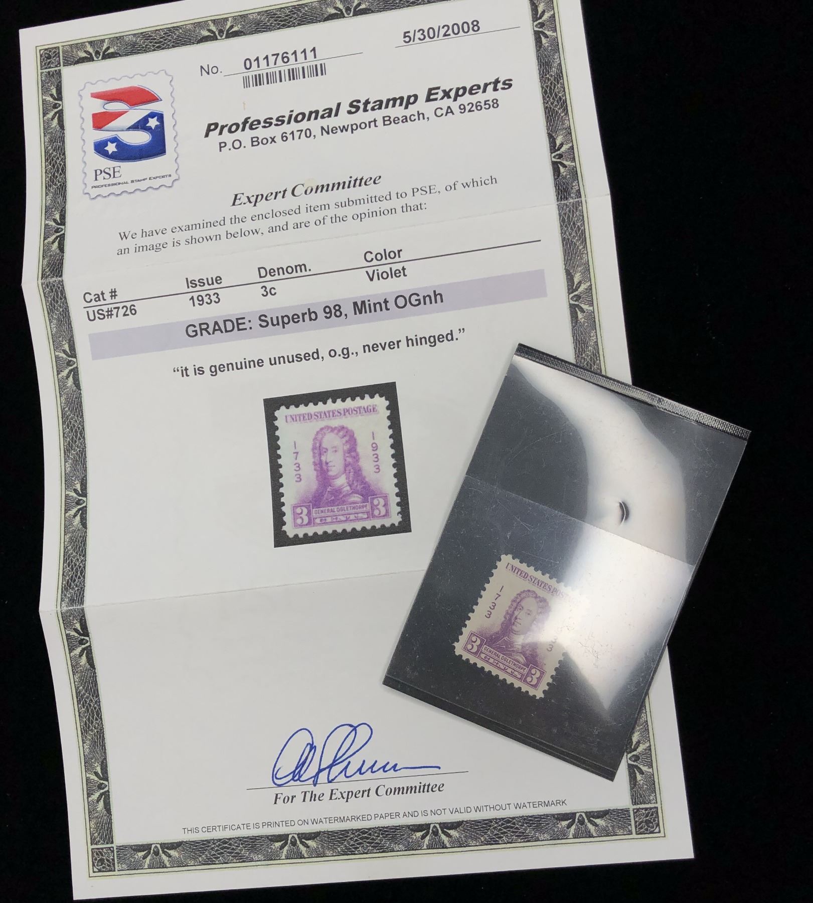 US Stamp SC#726 1933 3C Violet OGNH PSE Graded 98. Featuring James Edward Oglethorpe, founder of the colony of Georgia this stamp is in perfect condition. Superb 3C Violet issue, great quality stamp!
