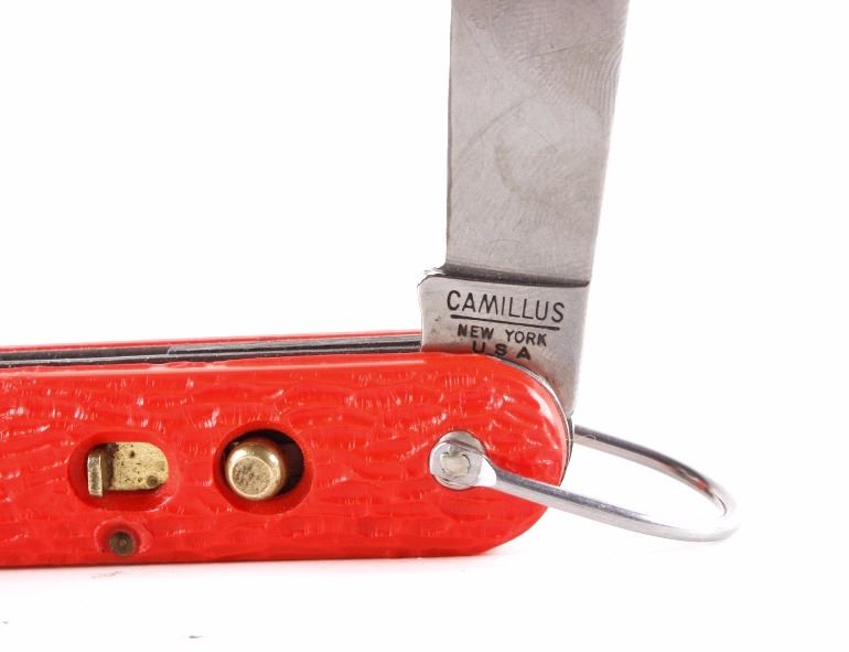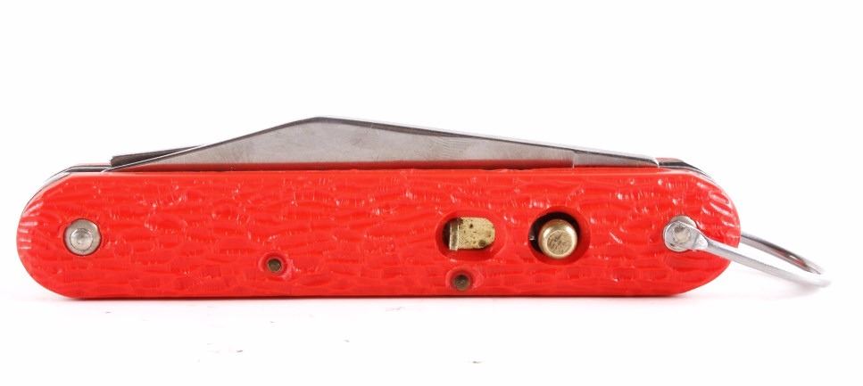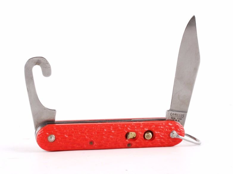 This is a rare original US Air Force issue fighter pilot escape switchblade knife made by Camillus, New York USA. The knife needs only one had to operate with a spring assisted push button mechanism and lock. The piece also includes a hook knife used to cut the parachute cords in the event of being stuck upon emergency landing. The knife is in good overall condition. There is some play in the blade when it is in the open position. The knife measures 7.25" long with a 2.75" blade.