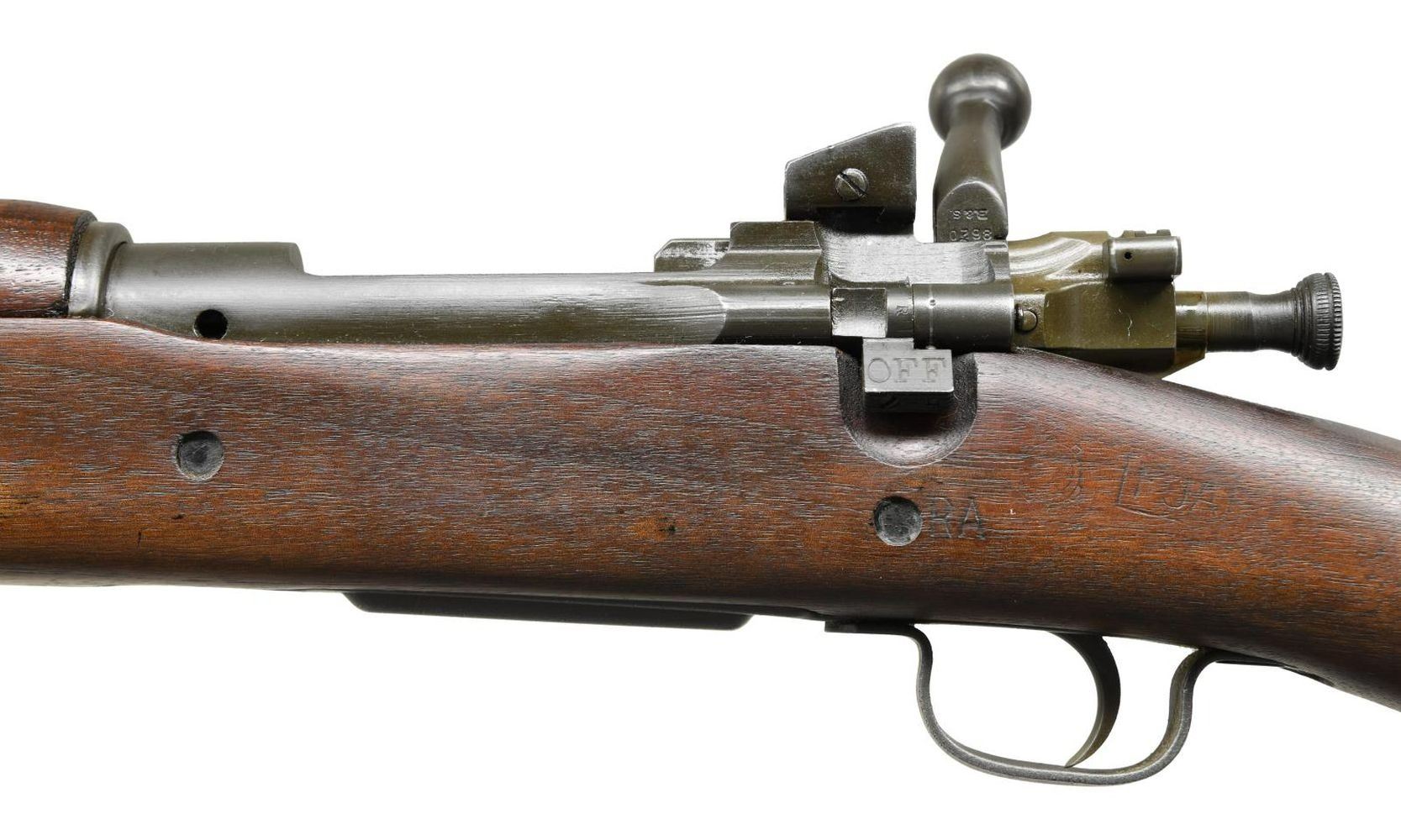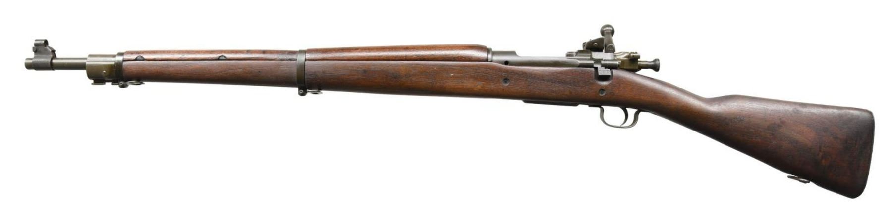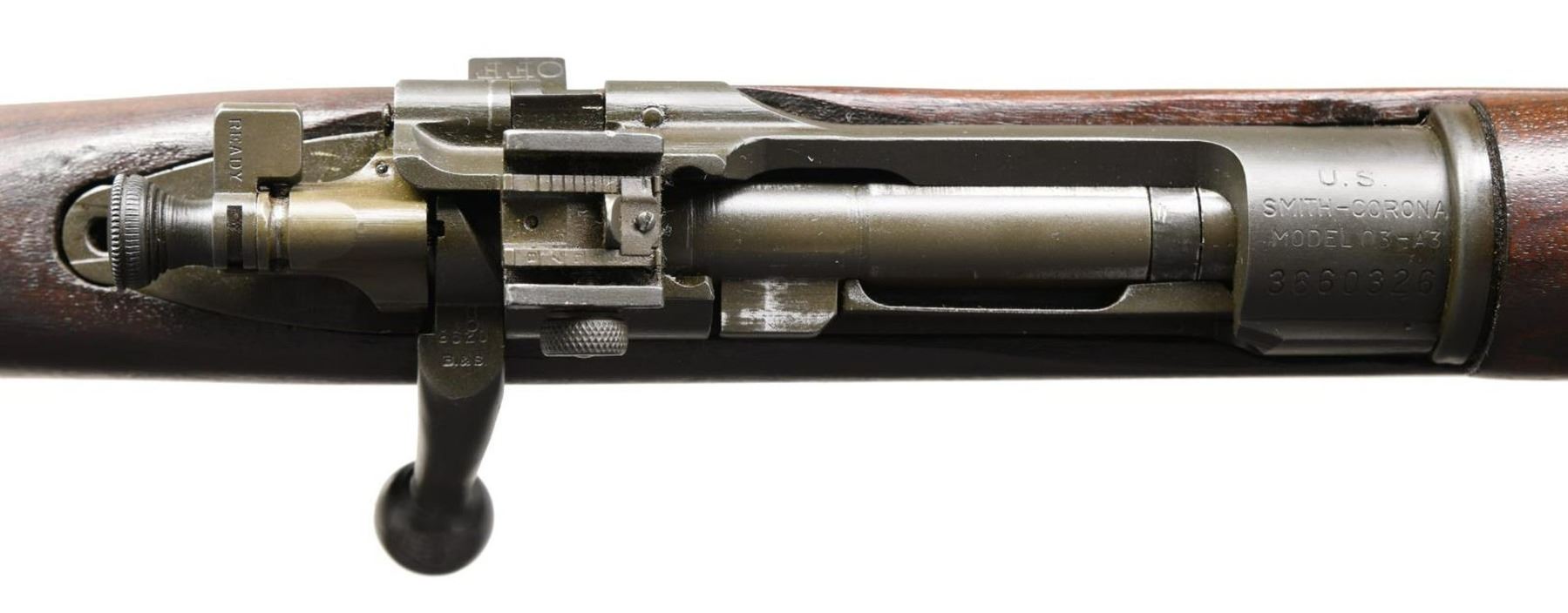 Cal. 30-06. S#3660326. Bbl. 24". Marked behind front sight "SC"/"flaming bomb"/"3-43". Adjustable aperture rear sight. Blade front sight. Stamped sight cover marked with "G" in triangle. Correct bolt marked on top of handle w/ flaming bomb "B. & S. 8620". Scalloped sleeve and straight safety lug. All stamped furniture including checkered butt plate & sm. bow trigger guard. The sm. bow trigger guard is by Remington as the raised portion at the front end is straight instead of the curve used by Smith Corona. Walnut stock set. Straight grip stock w/ 2 recoil bolts is marked on left side over trigger guard w/ cross cannons boxed "FJA" & "RA" indicating production by Remington Arms. Circled "P" proof under grip along w/ tiny "H". Stock has 2 "OG" markings in cheek area, one of which is boxed indicating an overhaul at the Ogden Utah Arsenal. CONDITION: stock set has very good original finish w/ light wear, staining & handling marks plus legible markings. Metal retains a very lg. degree of its original wartime parkerization w/ spots of light wear. Very good shiny bore. (23-5054/RW). CURIO. $800-1,100.