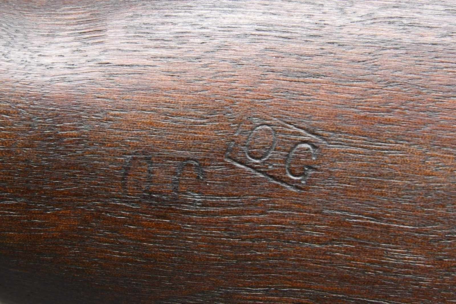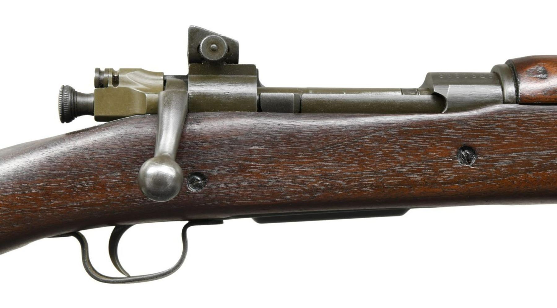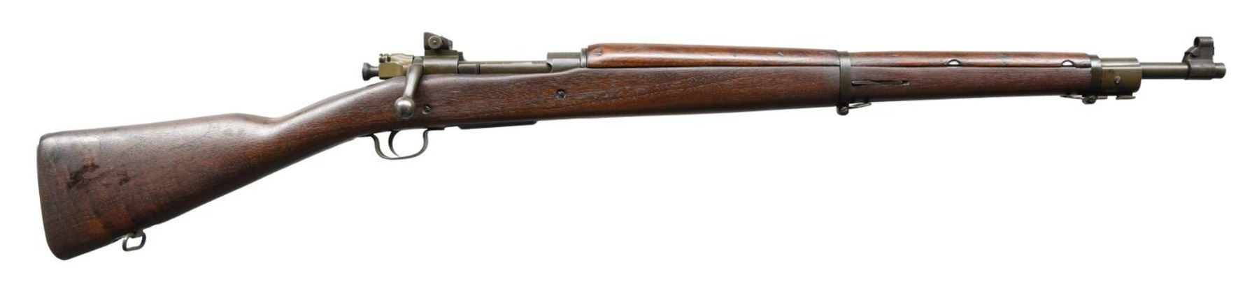 Cal. 30-06. S#3660326. Bbl. 24". Marked behind front sight "SC"/"flaming bomb"/"3-43". Adjustable aperture rear sight. Blade front sight. Stamped sight cover marked with "G" in triangle. Correct bolt marked on top of handle w/ flaming bomb "B. & S. 8620". Scalloped sleeve and straight safety lug. All stamped furniture including checkered butt plate & sm. bow trigger guard. The sm. bow trigger guard is by Remington as the raised portion at the front end is straight instead of the curve used by Smith Corona. Walnut stock set. Straight grip stock w/ 2 recoil bolts is marked on left side over trigger guard w/ cross cannons boxed "FJA" & "RA" indicating production by Remington Arms. Circled "P" proof under grip along w/ tiny "H". Stock has 2 "OG" markings in cheek area, one of which is boxed indicating an overhaul at the Ogden Utah Arsenal. CONDITION: stock set has very good original finish w/ light wear, staining & handling marks plus legible markings. Metal retains a very lg. degree of its original wartime parkerization w/ spots of light wear. Very good shiny bore. (23-5054/RW). CURIO. $800-1,100.