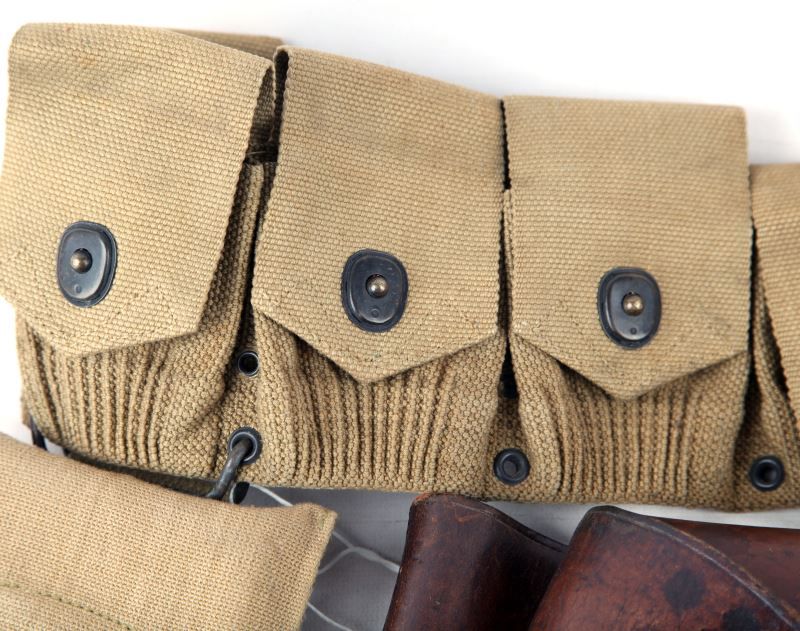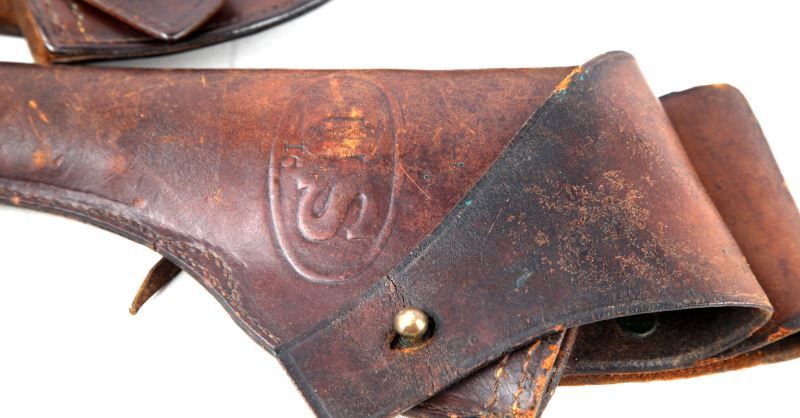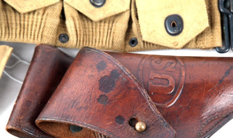 Three holsters including, 1917 Sears M1916 leather holster with US stamp on the front, marked Sears on the back. Marking on the inside flap are worn but still visible. Overall very good condition, one 1918 stamped the other unmarked these overall good each, 1918 stamped Mills ammo belt with full medical kit, larger size.