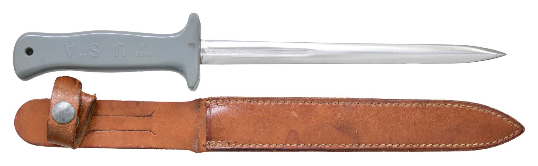 8 3/8" double edged fullered bright blade. 13 3/8" overall. These knives were made from salvaged blades of the 1913 Patton cavalry sword with the grey plastic handle cast in place. The handle has raised letters with those on the left side being "ANDERSON GLENDALE/ CALIFORNIA. the right side has "MADE IN USA". Brown leather sheath with "snap" retaining strap is unmarked. CONDITION: blade has light wear and small spots of staining. Handle has light wear and scattered small scratches. Sheath has moderate wear and staining but stitching remains tight. (02-23680/RW). NON GUN. $ 800-1,200.