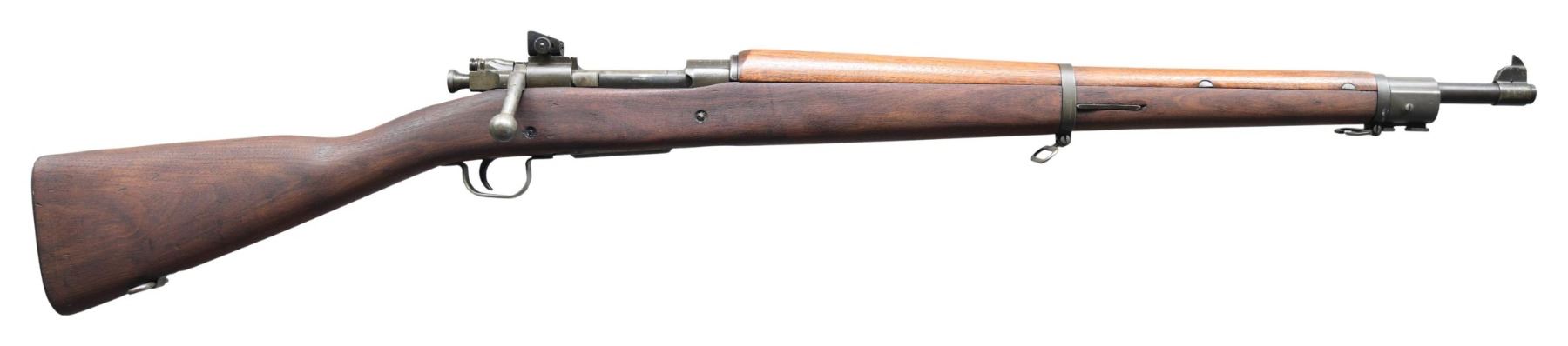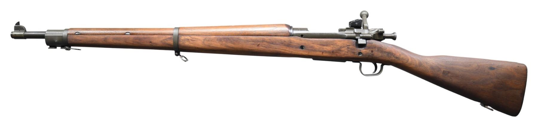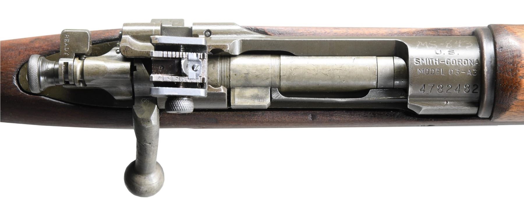 MILITARY RIFLE. Cal. 30-06. S# 4782482. Bbl. 24". Barrel markings have been removed. Adjustable aperture rear sight. Blade front sight. Correct Smith Corona bolt assembly with the rectangular safety lug and scalloped bolt shroud. All stamped furniture including the Remington produced large bow triggerguard and "R" marked upper band. Walnut stock set. Straight grip buttstock has two recoil bolts. Stock marked with boxed "OG" at cheek and two proofs under grip. Faint boxed "FJA" on left side. CONDITION: stock set has light wear and handling marks with its arsenal rework finish. Metal retains most of its arsenal rework Parkerization with light wear. Very good shiny 4 groove bore. (25-2762/RW). CURIO. $500-800.