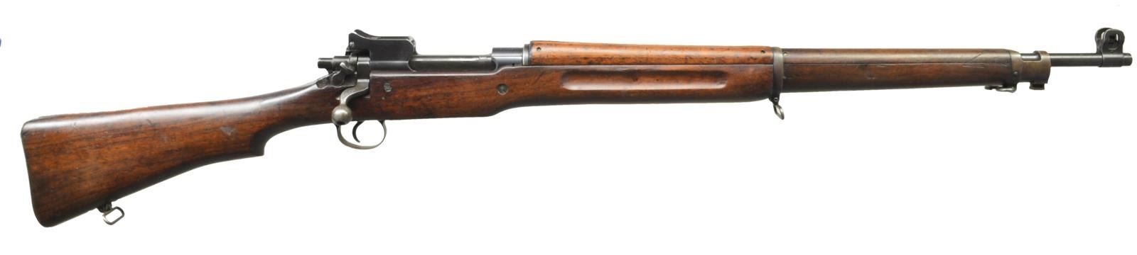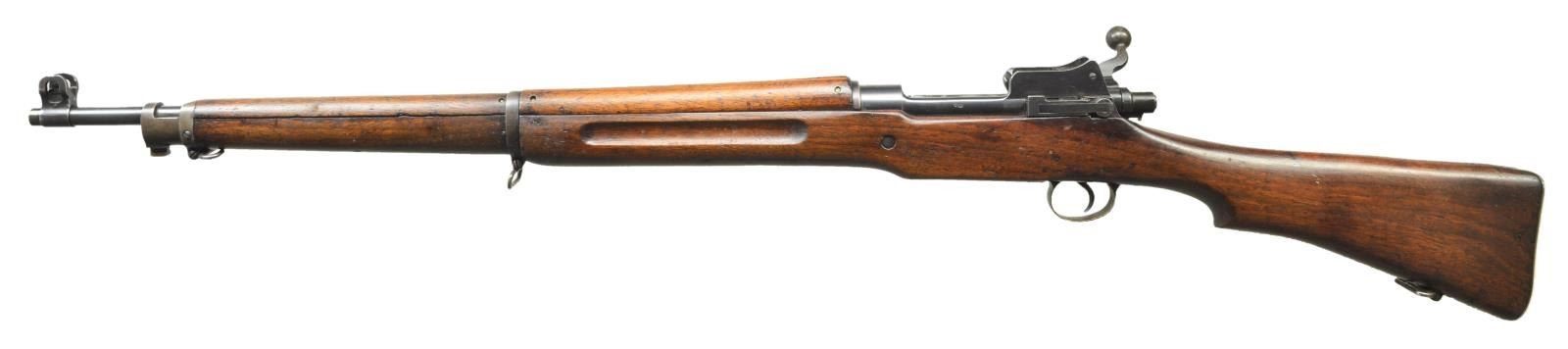 RIFLE. Cal. 30-06. Ser. #570327. Bbl. 26". Bbl. is marked behind front sight "R" "Flaming bomb" "9-18". Receiver rail marked on left side w/ "flaming bomb". Receiver ring marked "U.S." "MODEL OF 1917" & "REMINGTON". Bolt & cocking piece are marked "E". Rear sight & stock tip marked "R". Bolt handle is additionally marked on top w/ Flaming bomb" & "A". Ladder rear sight graduated to 1600 yds. Blade front sight w/ protective ears. Walnut stock set marked w/ eagle acceptance mark under pistol grip. Trap buttplate. CONDITION: stock set has moderate wear & handling marks commensurate w/ long service. Notable long scratch on left side below grasping groove. Metal retains 70% original blue finish. Furniture has notable patina appearance. Good bore w/ strong lands turning dark in the grooves. Mag. follower has been ground to allow bolt to close on empty mag. (22-4070/RW) CURIO. $350-550.