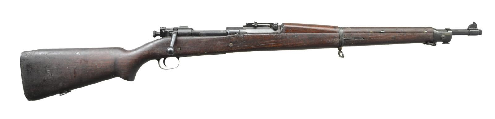 RIFLE W/ REPLACEMENT "C" STOCK. Cal. 30-06. Ser. #311194 . Bbl. 24". Marked behind front sight "RIA" "flaming bomb" & dated "10-18". Ladder rear sight graduated to 2850 yds. w/ volley notch. Flat windage knob, Dished elevation knob. Blade front sight. Bolt is electro penciled to match. Bolt is Remington produced 1903/83 interestingly w/ square type safety lug. All bolt parts including underneath bolt handle marked "R". All milled furniture including checkered trap buttplate. Walnut stock & handguard. Buttstock is "C" type. Stock is marked in cutoff recess w/ "S" indicating Springfield mfg. Buttstock is marked on right side w/ "S#1194". Marked on bottom at belly w/ "7". Marked ahead of trigger guard w/ "X". CONDITION: stock set has moderate wear, staining & handling marks throughout over original finish. Metal parts have worn blue black appearance turning gray. Rear sight base is Parkerized. Shiny bore w/ lightly worn lands. (22-4090/RW) CURIO. $400-600.