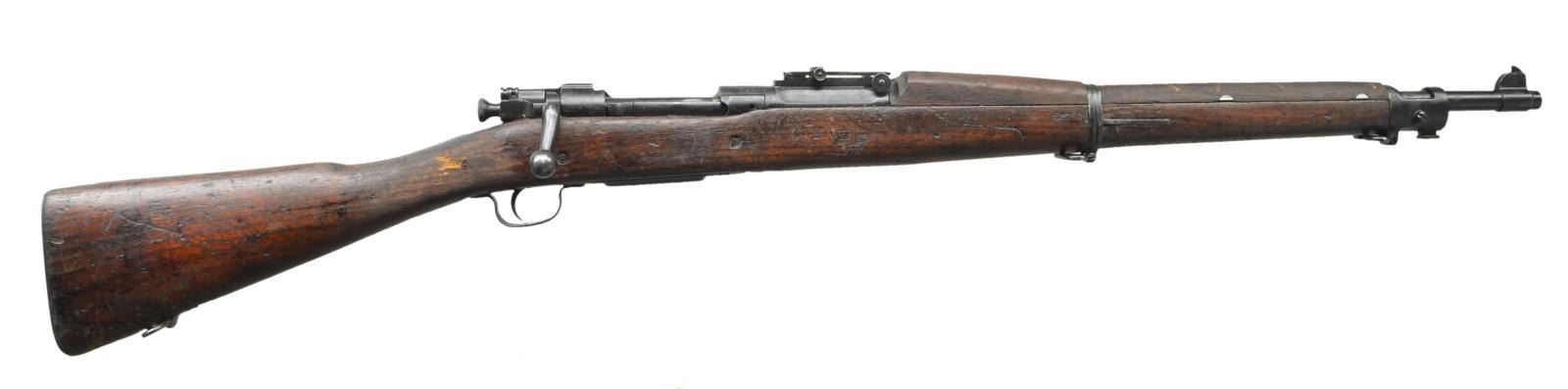 RIFLE. Cal. 30-06. Ser. #1152842 . Bbl. 24" marked behind front sight "SA" "flaming bomb" "12-19". Ladder rear sight graduated to 2850 yds. w/ volley notch. Flat windage knob. Dished elevation knob. Blade front sight. Receiver made w/ ejection port in left rail to accommodate Pedersen device. Trigger & mag. cutoff changed to std. configuration. Stamped follower. Milled upper & lower bands w/ flat smooth buttplate. Stamped sm. bow trigger guard. Unmarked walnut stock set. CONDITION: stock set has heavy wear, staining, dents & scratches throughout. Metal has arsenal rework type finish w/ wear, dents & scratches. Bolt handle electro penciled to match. Very good shiny bore. (22-4085/RW). CURIO. $400-600.