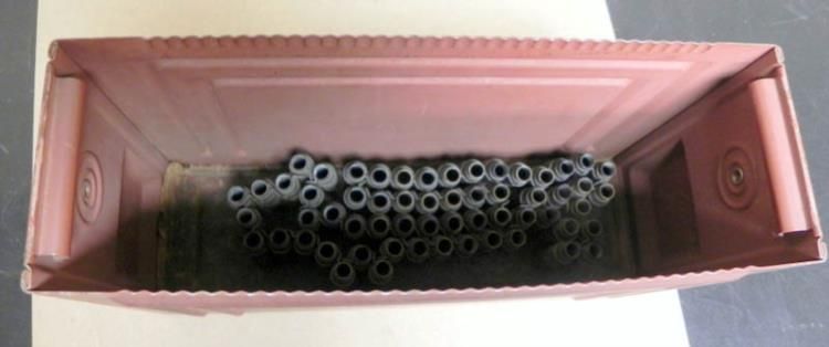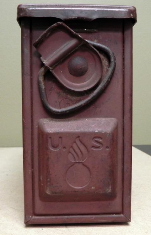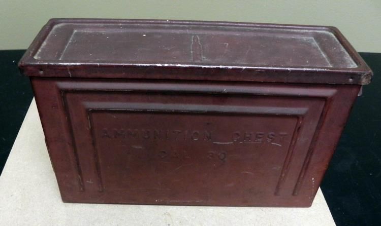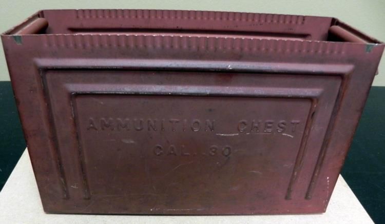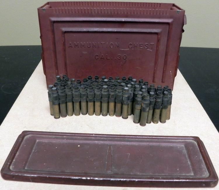OFFERED HERE IS AN US WWII 30 CAL AMMUNITION CHEST W/FULL BANDOLIER OF 30 CAL SHELLS. GREAT HISTORICAL PIECE-- FRONT READS--U.S. WITH FLAMING BOMB--RAISED SHELL ON CHEST LID--SIDE SWIVEL LOCKS ON CHEST.