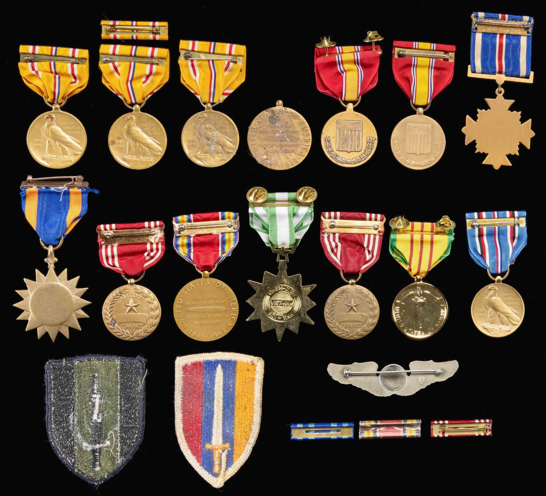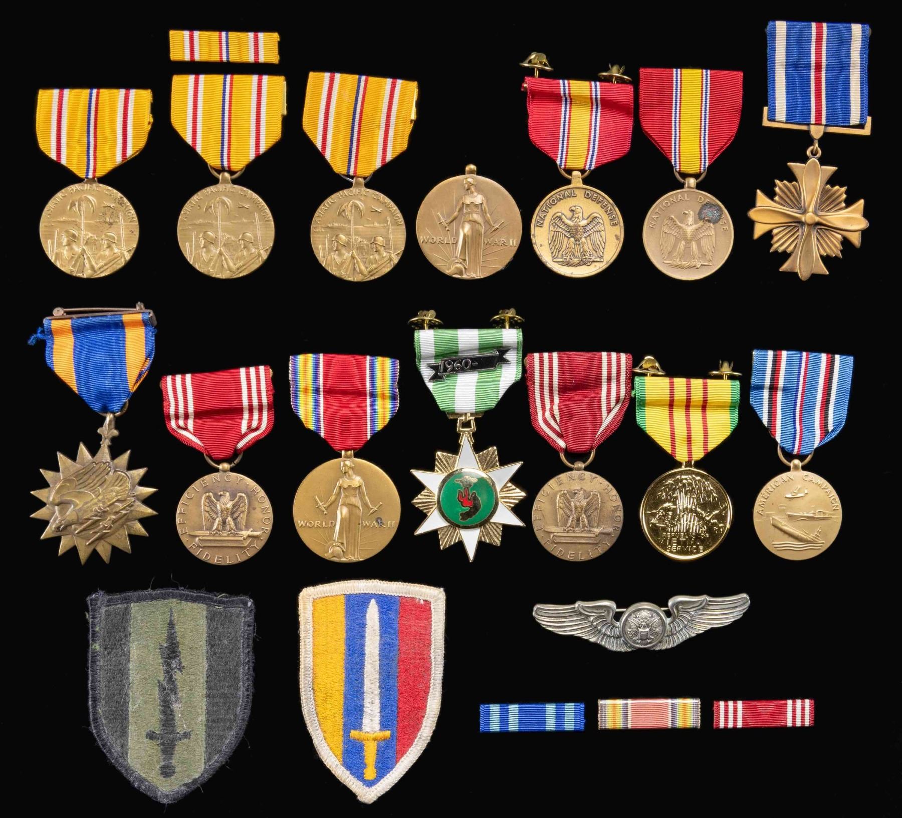 This lot contains 3 Asiatic-Pacific Camapign medals. / 1 Air medal. / 1 Distinguished Flying Cross. / 2 National Defense medals. / 2 WWII Victory medals, one is missing its ribbon. 1 American Campaign medal. / 1 Vietnam Service medal. / 1 Republic of Vietnam Service medal. / 2 Army Good Conduct medals. / 1 Full size Army enlisted aircrew wings. / 4 ribbon bars. / 2 patches. CONDITION: all items show very light wear. (02-25058-1/BF). $75-150.