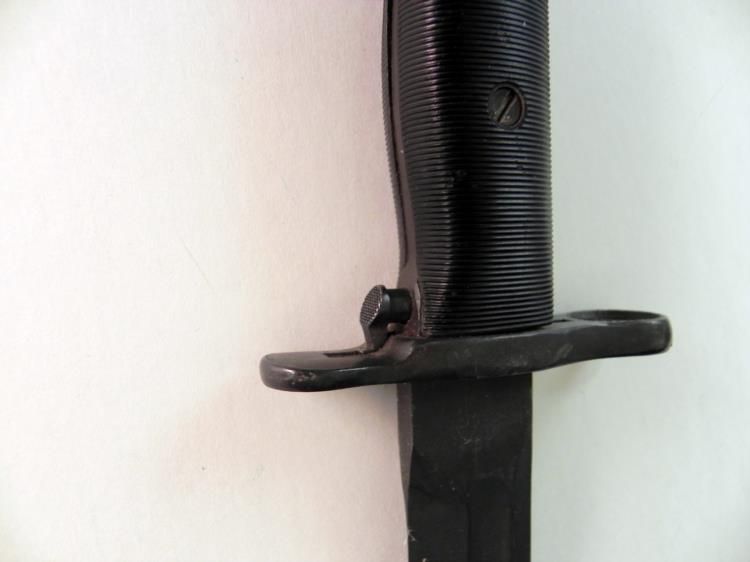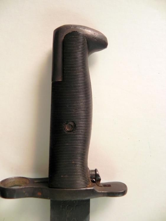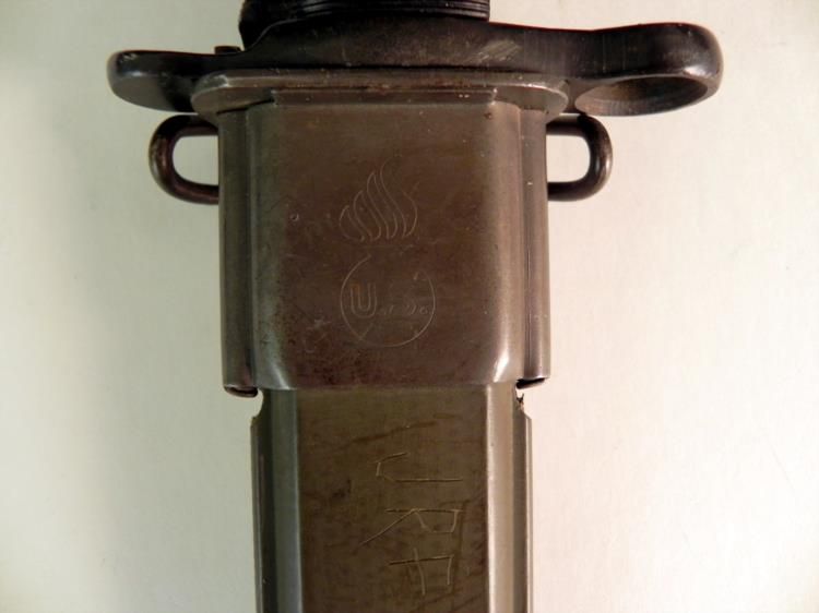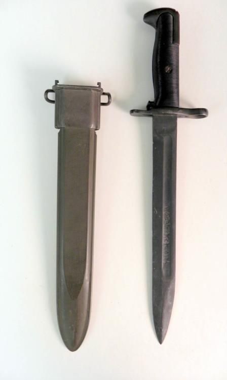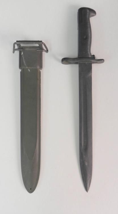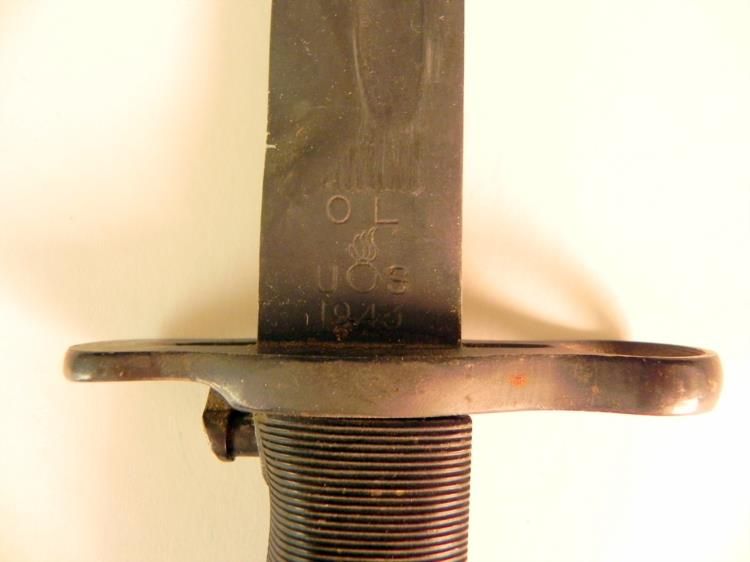US WWII M1 BAYONET-W/M7 SCABBARD-ONEIDA 1943---NICE WWII M1 BAYONET WITH 10" DARKENED BLADE -RICASSO MARKED "OL" FOR ONEIDA LTD IN ONEIDA, NY-WITH FLAMING BOMB LOGO AND "US" WITH 1943 DATE---RELEASE WORKS FINE AND GRIP IN NICE SHAPE--M7 SCABBARD WITH US & FLAMING BOMB ON TOP FITTING.