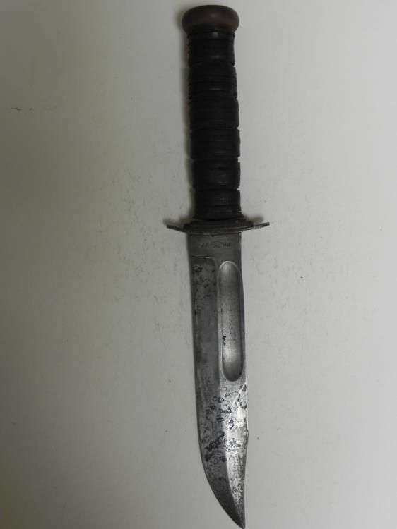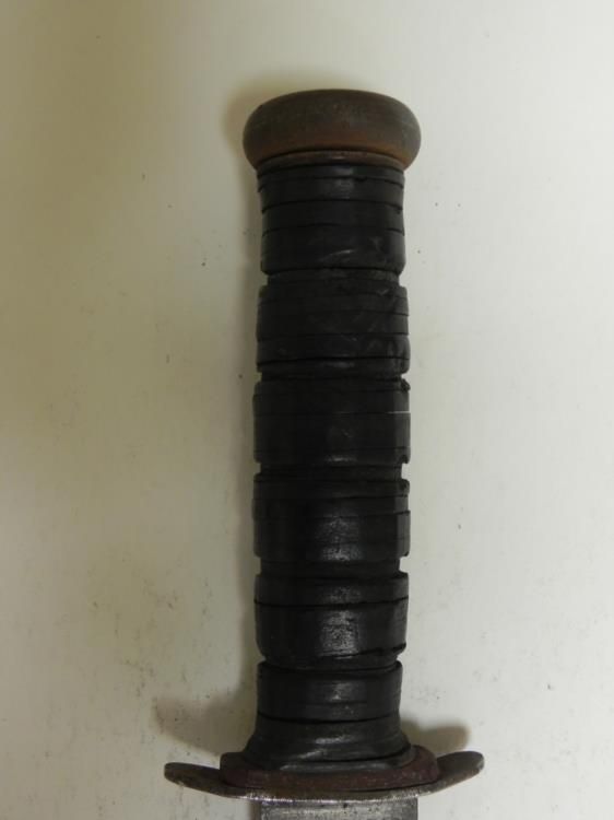 OFFERED HERE IS A US WWII NAVY PAL MARK 2 FIGHTING KNIFE. 7" BLADE--BOWIE TYPE BLADE-LEATHER WASHER GRIP-RICASSO MARKED "U.S. NAVY" AND REVERSE "PAL-RH 37"-NO SHEATH-POMMEL TOP PIN ANCHOR RAISED AND MAKES TOP WASHERS LOOSE-DEFINITELY SAW WWII ACTION
