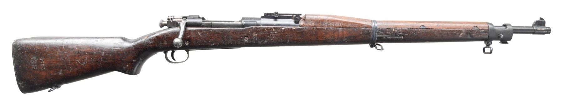 RIFLE. Cal. 30-06. S# 3236563. Bbl. 24". Replacement barrel has "SA / flaming bomb / 5-42" marking behind front sight. Ladder rear sight w/ volley notch graduated to 2,850 yards. Blade front sight. Bolt is marked on top "BF 4 1". Bolt shroud & safety marked "R". All milled furniture including smooth trap buttplate. Walnut stock set. Pistol grip stock is the 1903A3 type w/ 2 recoil bolts. Stock is marked at end of pistol grip w/ boxed "P" proof. Buttstock is numbered on right side to match rifle, leaving a formerly applied number partially removed. Replacement handguard. UNATTACHED ACCESSORIES: plastic oiler in butt. CONDITION: stock has extensive wear & handling marks throughout. Metal has worn arsenal rework finish, turning gray. Very good shiny four groove bore. (25-3823/RW). CURIO. $400-600.