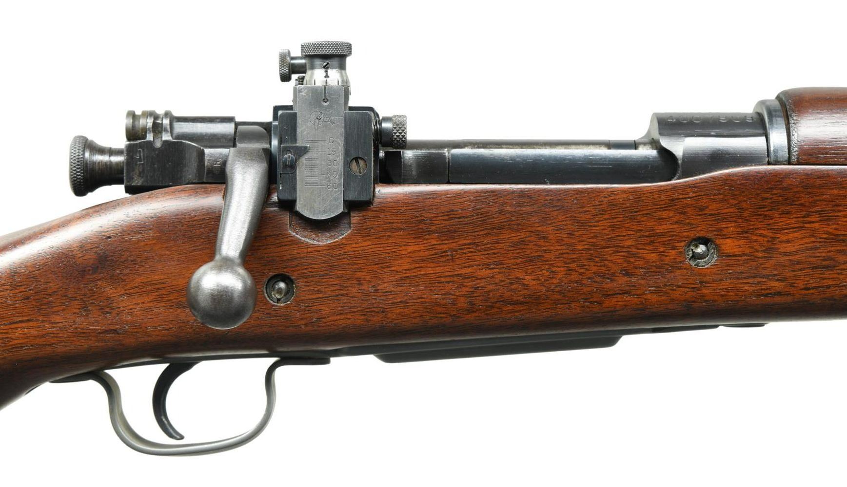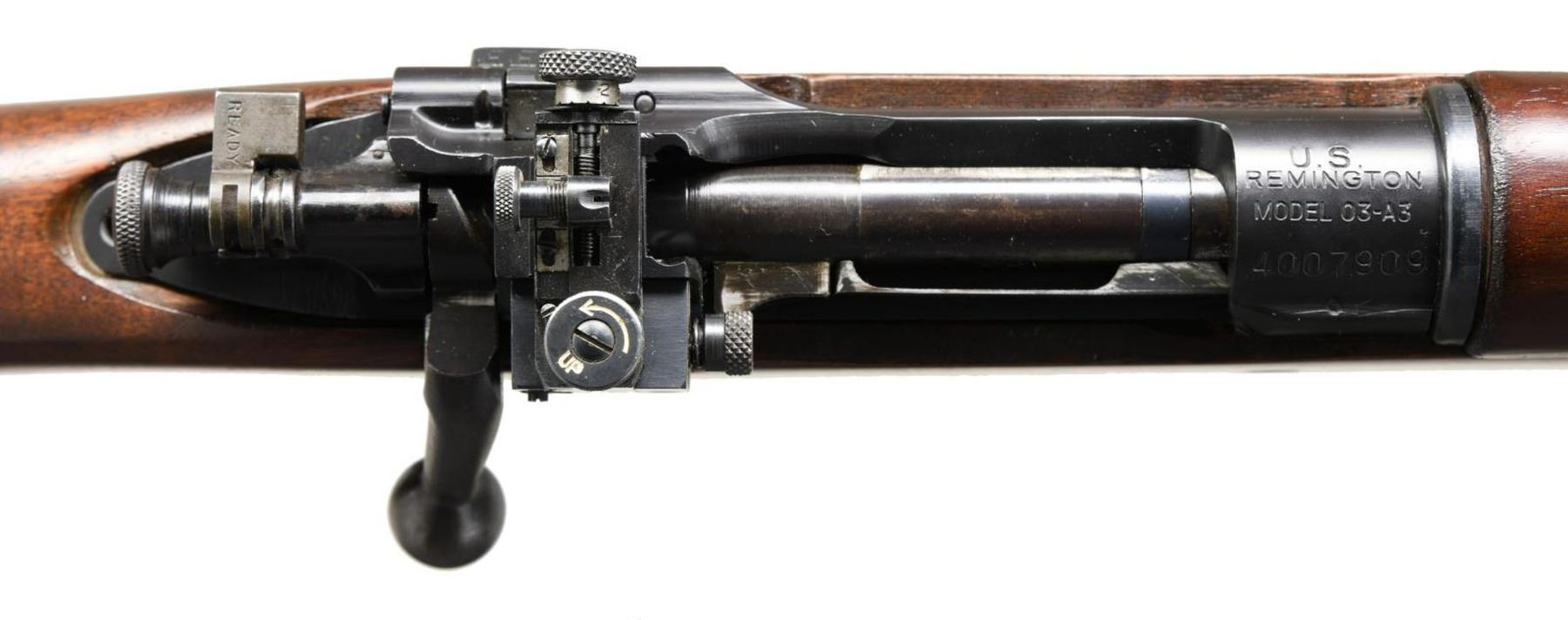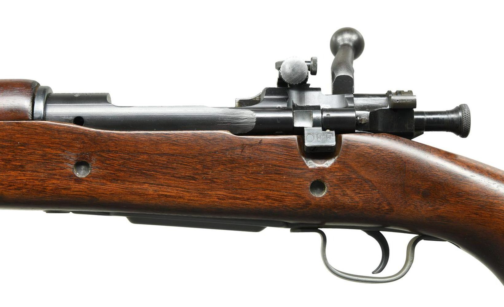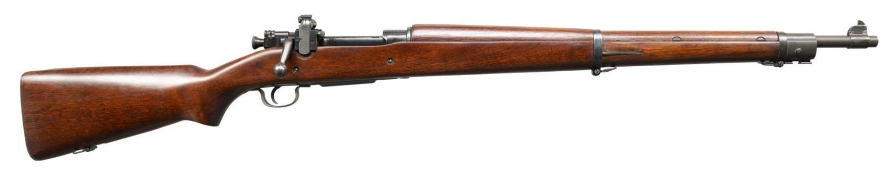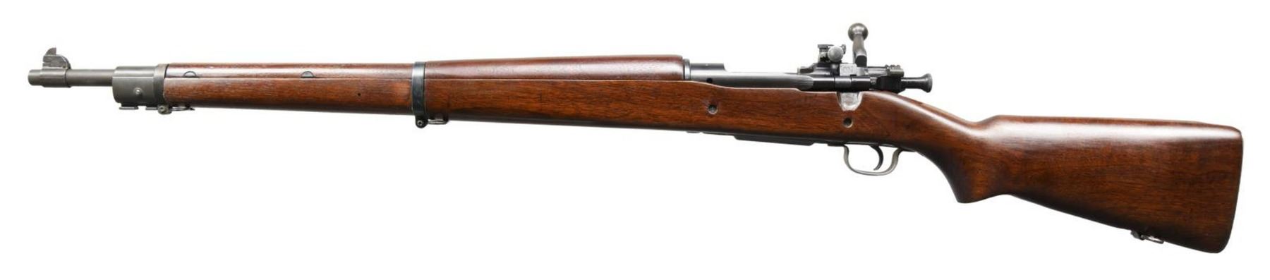 MILITARY BOLT ACTION MATCH RIFLE. Cal. 30-06. S# 4007909. Bbl. 24" marked behind front sight "RA" flaming bomb "12-43". Original rear sight replaced by a Lyman 48S w/ a short slide graduated to 60 points. Sight is equipped w/ the late type lg. target knobs. Sight base has no visible numbers inside dovetail. 1903 style front sight w/ fixed & movable bases. Front sight blade is wide target style measuring approx. .085 in width. Bolt assembly is marked "R" as is the mag. cutoff. Trigger has been replaced by an aftermarket single stage model. All stamped furniture including sm. bow trigger guard. Milled fine checkered trap buttplate. Walnut stock set w/ late type WWII pistol grip. Stock is unmarked. Made w/ 2 recoil bolts & w/out grasping grooves. CONDITION: this attractive rifle was assembled w/ care & attention to detail. The action & trigger guard appear to be glass bedded into the stock. The cutoff recess has been slightly enlarged & the stock has a shallow cut beneath the bolt handle. The stock was originally cut for an earlier version of the Lyman sight & has a walnut filler installed below the base. Stock has very light wear & tiny handling marks w/ a professional finish. The action has been blued w/ great care to leave the markings & machine marks intact. Balance of metal has mix of parkerized & blue finishes. Bore shows careful use w/ lightly worn lands retaining a shiny appearance. (23-5058/RW). CURIO. $900-1,100.