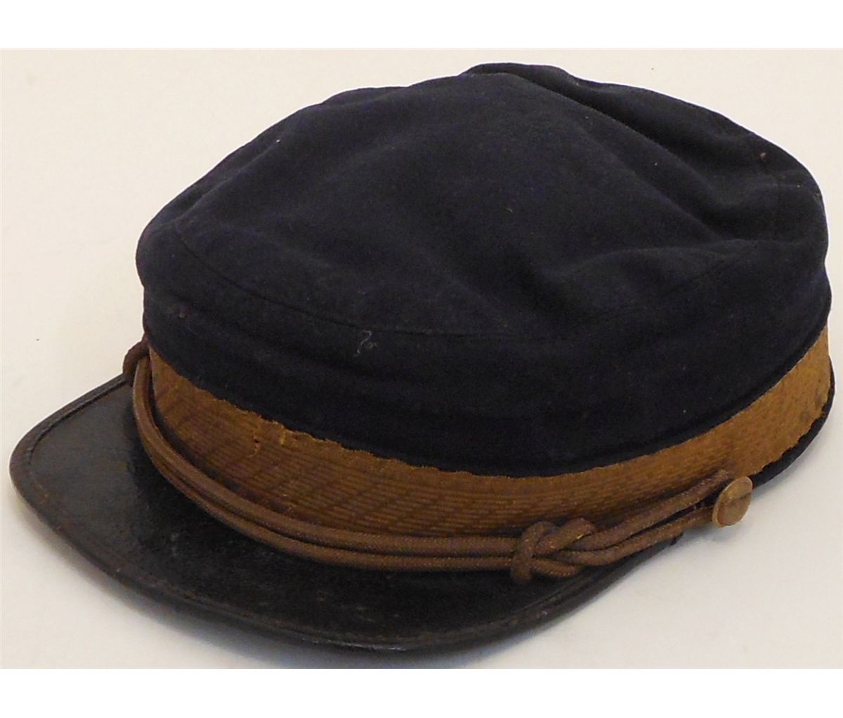 Blue wool Kepi with a leather brim, a gold band and cord, brass Eagle buttons. Marked inside: Charles Naylor 118 N TH 5th St Phila. Missing front pin. Used condition showing use wear.
