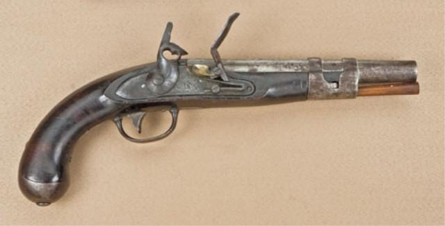US model 1813 Flintlock pistol by S. North of Middleton CT, .69 caliber smoothbore, approx. 9-1/16” barrel, 15-1/4” overall, marked S. North. With eagle at center portion of lock, US over Midln Con. Refer Flayderman 6A-015. One of only approx. 1626 made. The pistol shows an excellent reconversion to flintlock using what appears to be an original hammer, frizzen and spring, and is almost imperceptible. The top jaw and screw are missing. The metal surfaces are good with some scattered erosion and pinprick pitting, good sharp markings on lock. The stock is exceptionally good with 75% cartouche showing on left side. Some minor marks, scratches, but at least very good overall. An original to the period metal tipped hickory ramrod is included. A significant and desirable US martial pistol, just in need of a top-jaw and screw. The reconversion work is top-shelf, and imperceptible without disassembly and examination of lock and inside of barrel. Est: $2,500 - $5,000