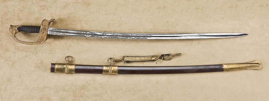 US model 1850 officer’s sword retaining original scabbard in near fine condition. The blade shows an “S” and “R” stamp which are probably Soligen and most likely an imported blade. The blade is in fine condition showing its original polish and all of its fancy etching, which extends over halfway down the blade with scenes of eagle, stands of arms, scrolls, e pluribus unum, US, etc. The cast brass hilt shows US and floral wreaths and slightly fancier than normal with wire-wrapped sharkskin handle in very good to near fine condition. The hilt and pommel retain 80-90% toned original gilt. The scabbard shows 80-90% tobacco brown finish on body with 50-60% toning original gilt. The blade measures approx. 32-1/4”, 37-7/8” overall. An outstanding officer’s sword with just a slight amount of use and light carry and very little aging. Est: $1,250 - $2,500